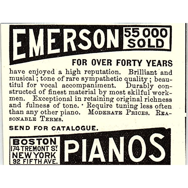 Emerson Pianos 174 Tremont St Boston 92 5th Ave NY 1892 Ad AG2-S25