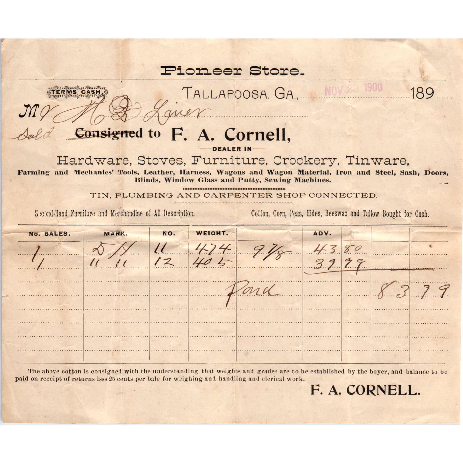 F.A. Cornell Pioneer Store Tallapoosa GA 1890s Original Billhead Letterhead Receipt D8-LL