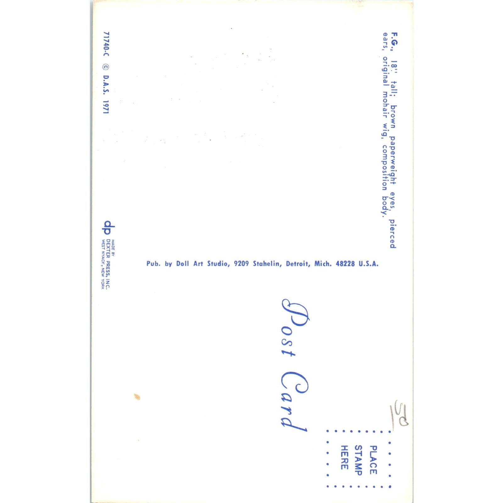FG Brown Paperweight Eyes Composition Body Doll Art Studio 1971 Original Postcard PB6