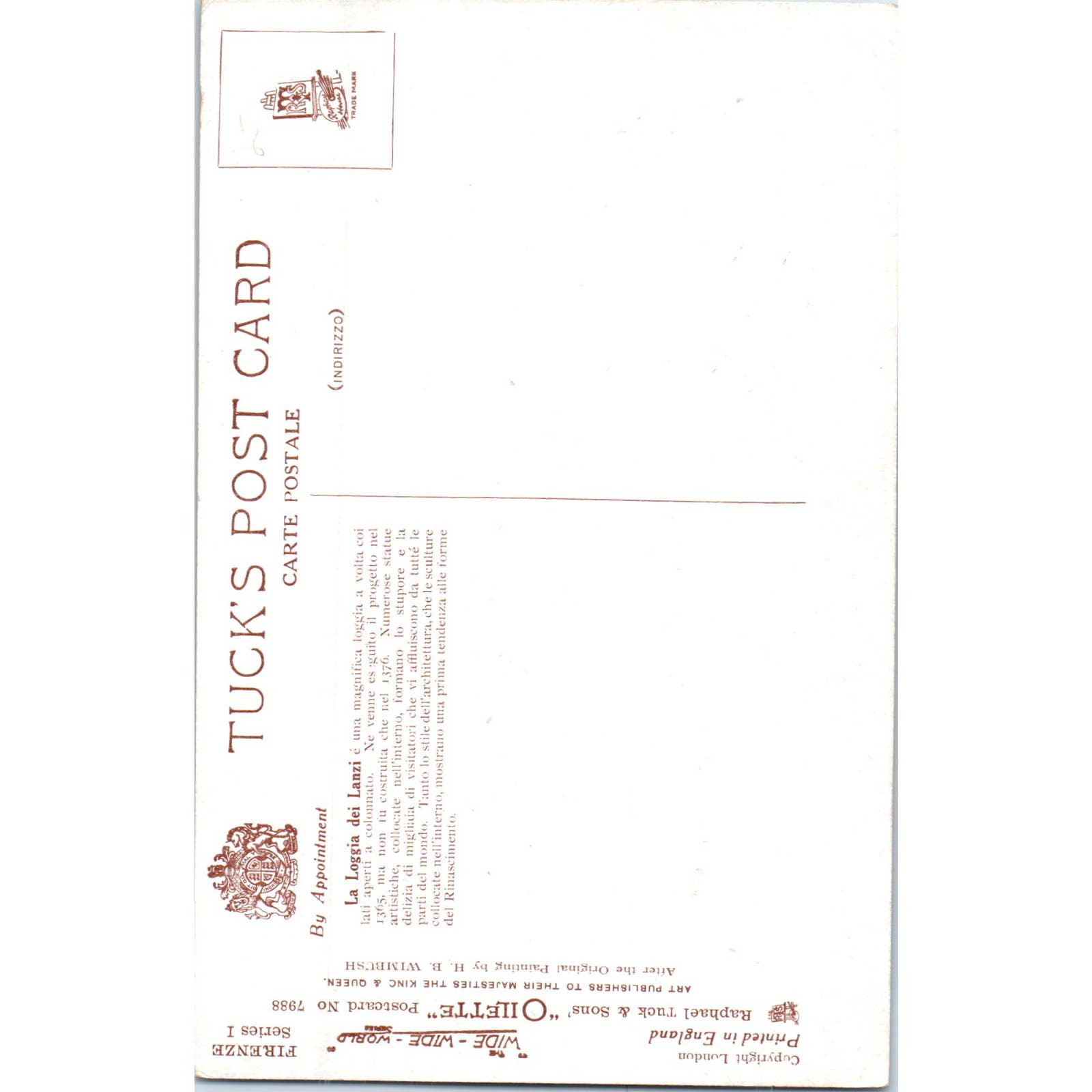 Firenzie La Loggia Dei Lanzi Raphael Tuck Oilette Original Postcard TK1-P17
