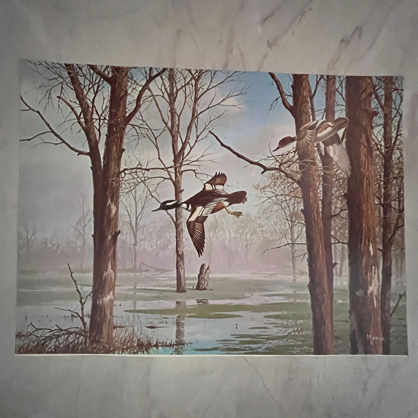 Flying Merganser Duck - Maass Lithograph 12x16" Art Print FL1