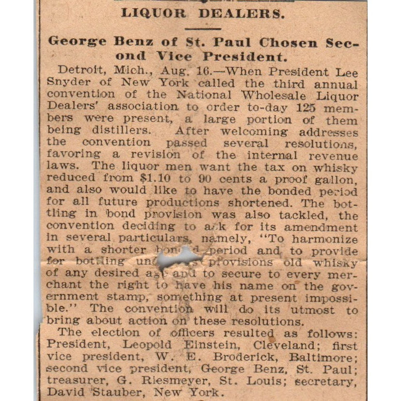 George Benz National Wholesale Liquor Association St. Paul 1898 Newspaper AF2-Q2