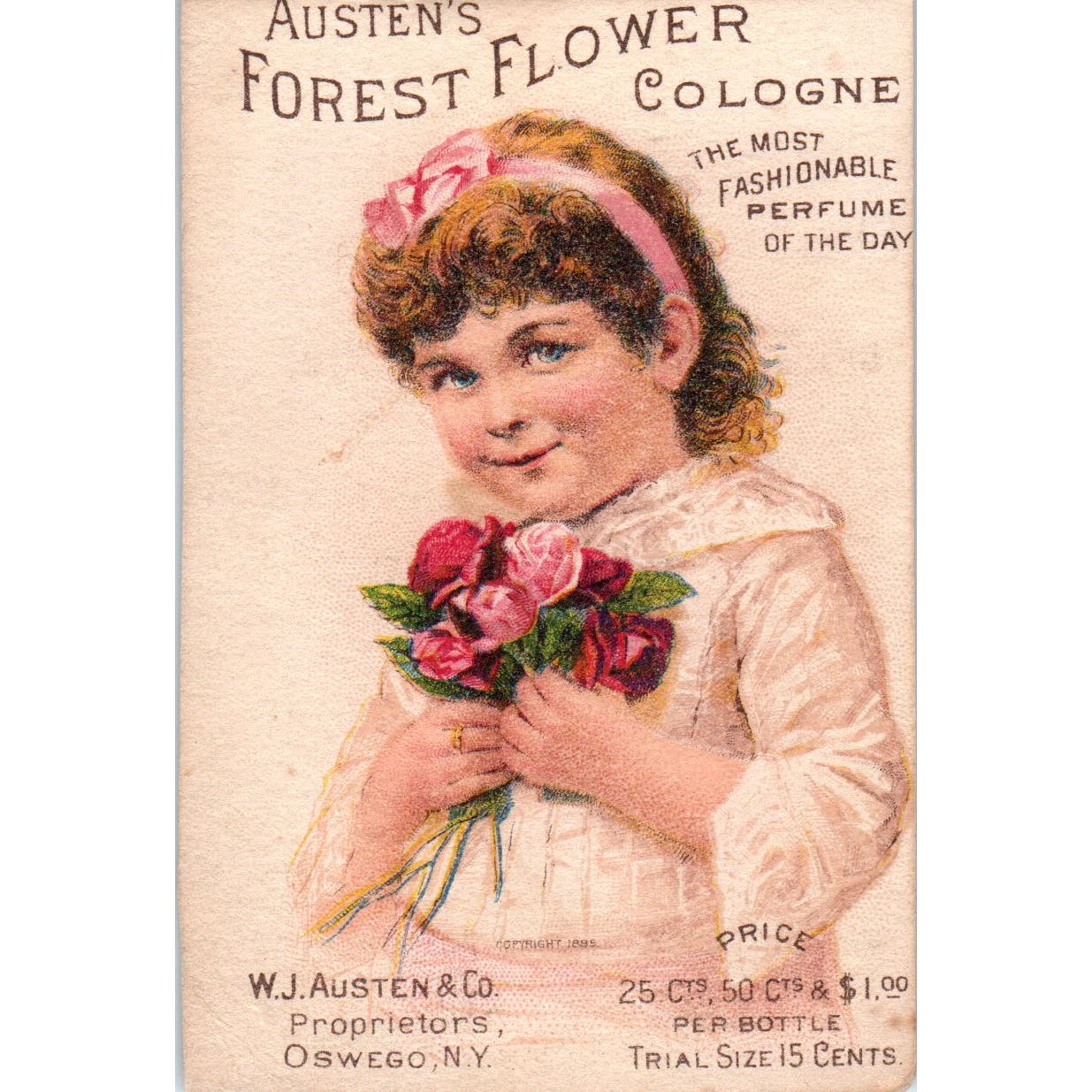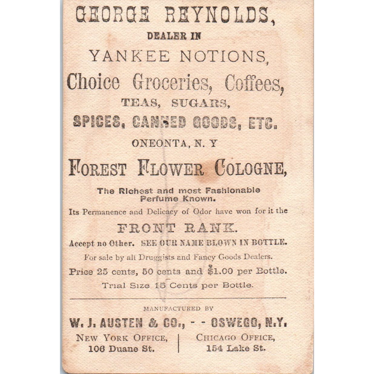 George Reynolds Oneonta NY W.J. Austen Oswego Perfume c1880 Trade Card AE5
