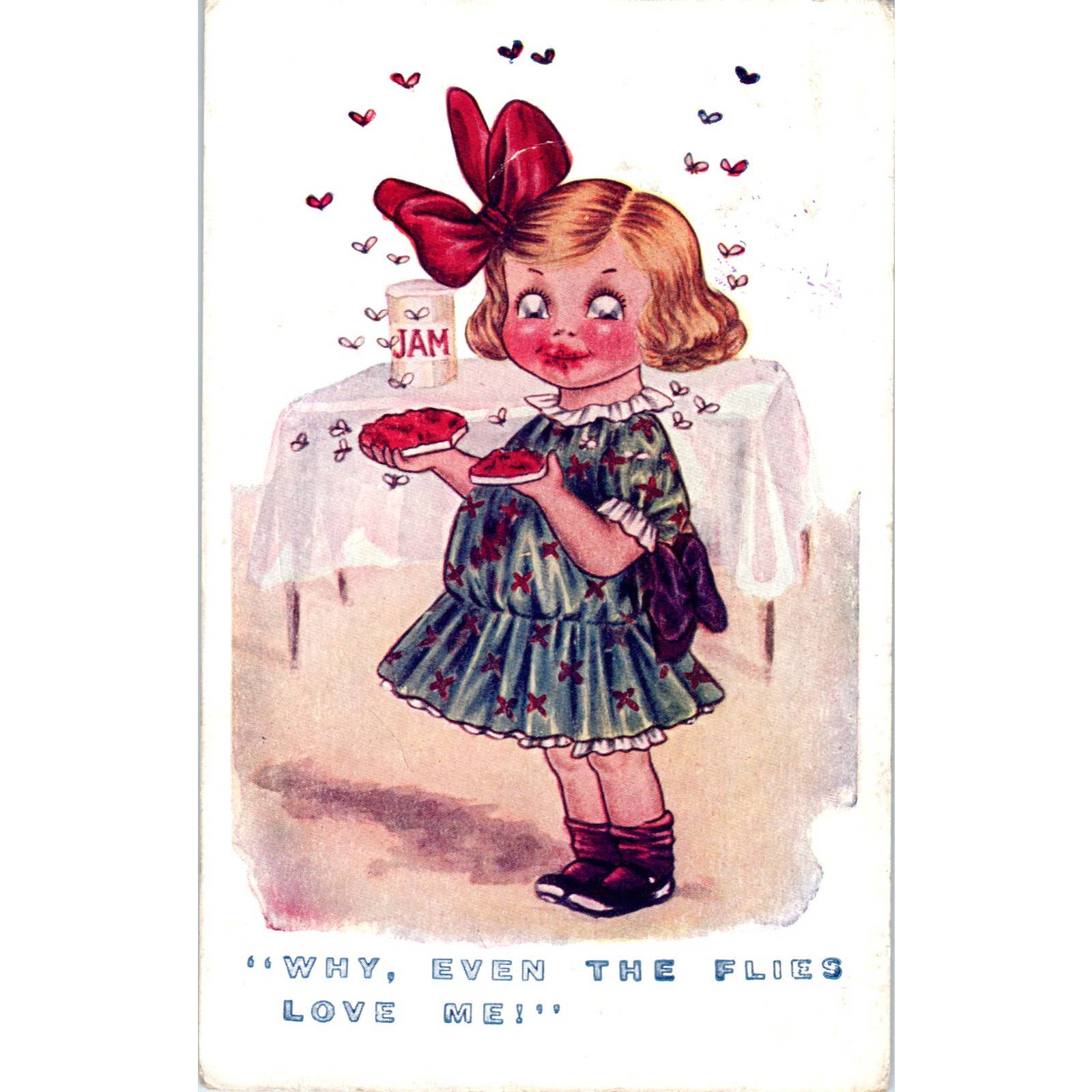 Girl in Jam Jar With Flies Humor Illustration c1910 Original Postcard TK1-22