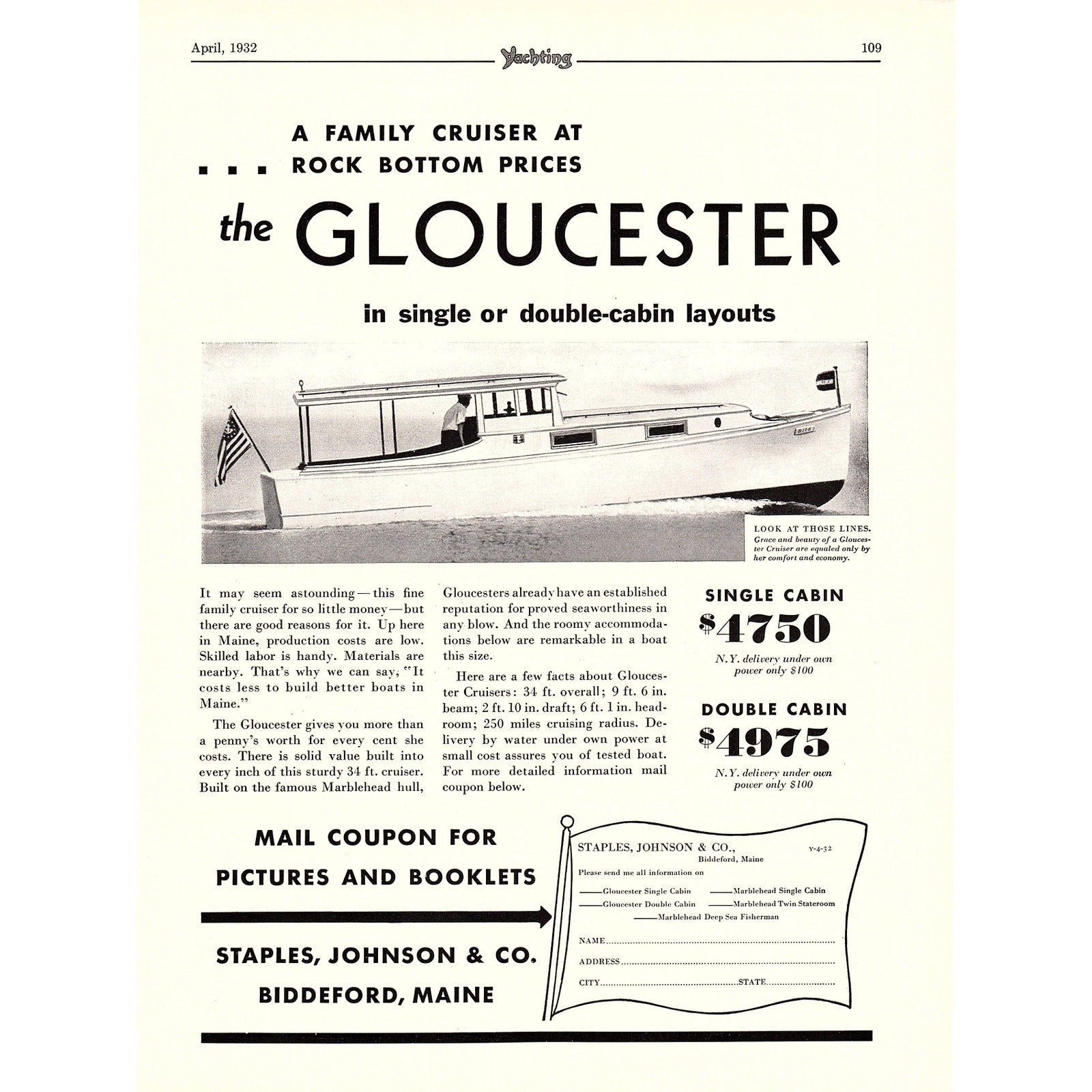 Gloucester Cruisers Staples, Johnson & Co Biddeford ME John G Alden 1932 Ad V1-4