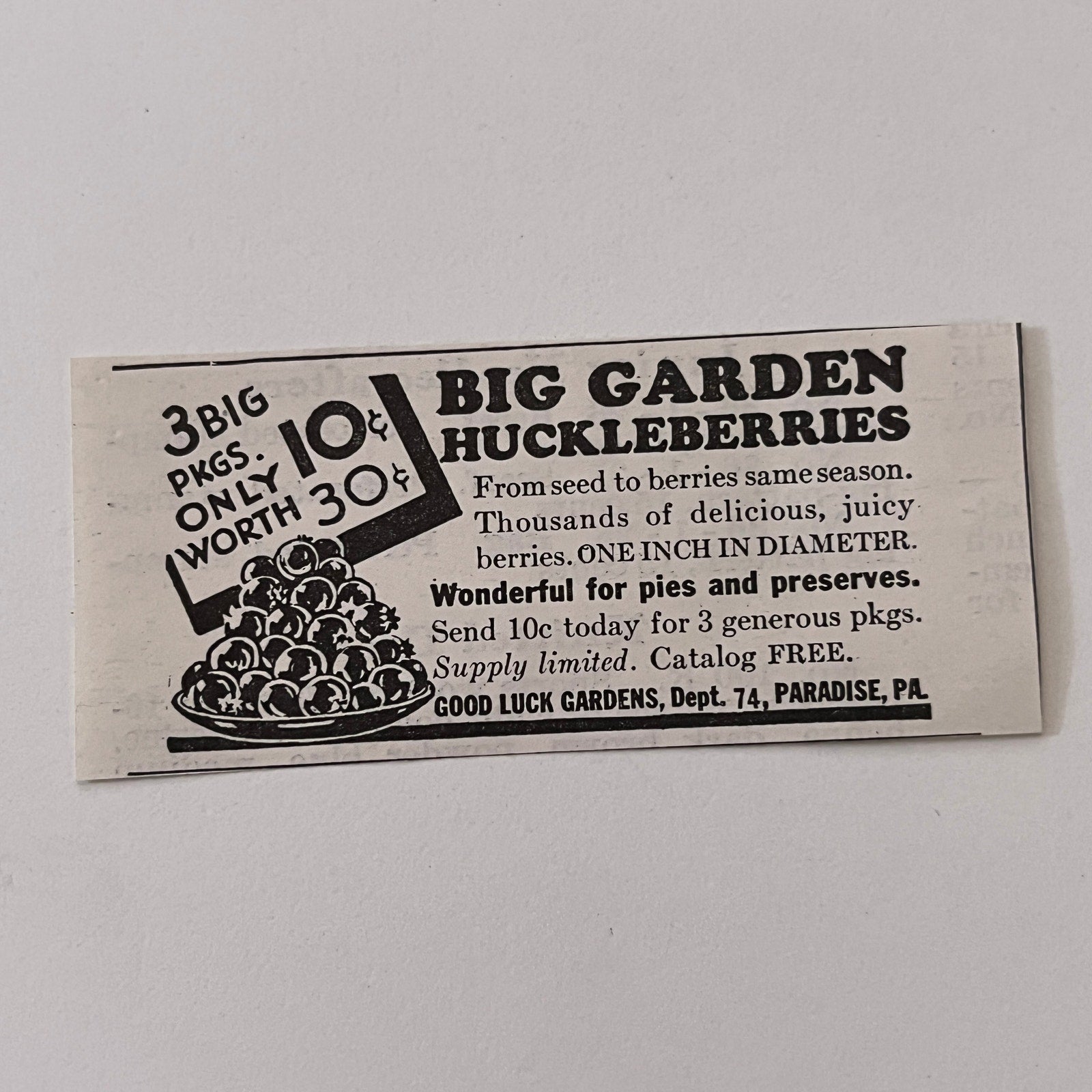 Good Luck Gardens Big Garden Huckleberries Paradise PA 1936 Ad SAG4-M4