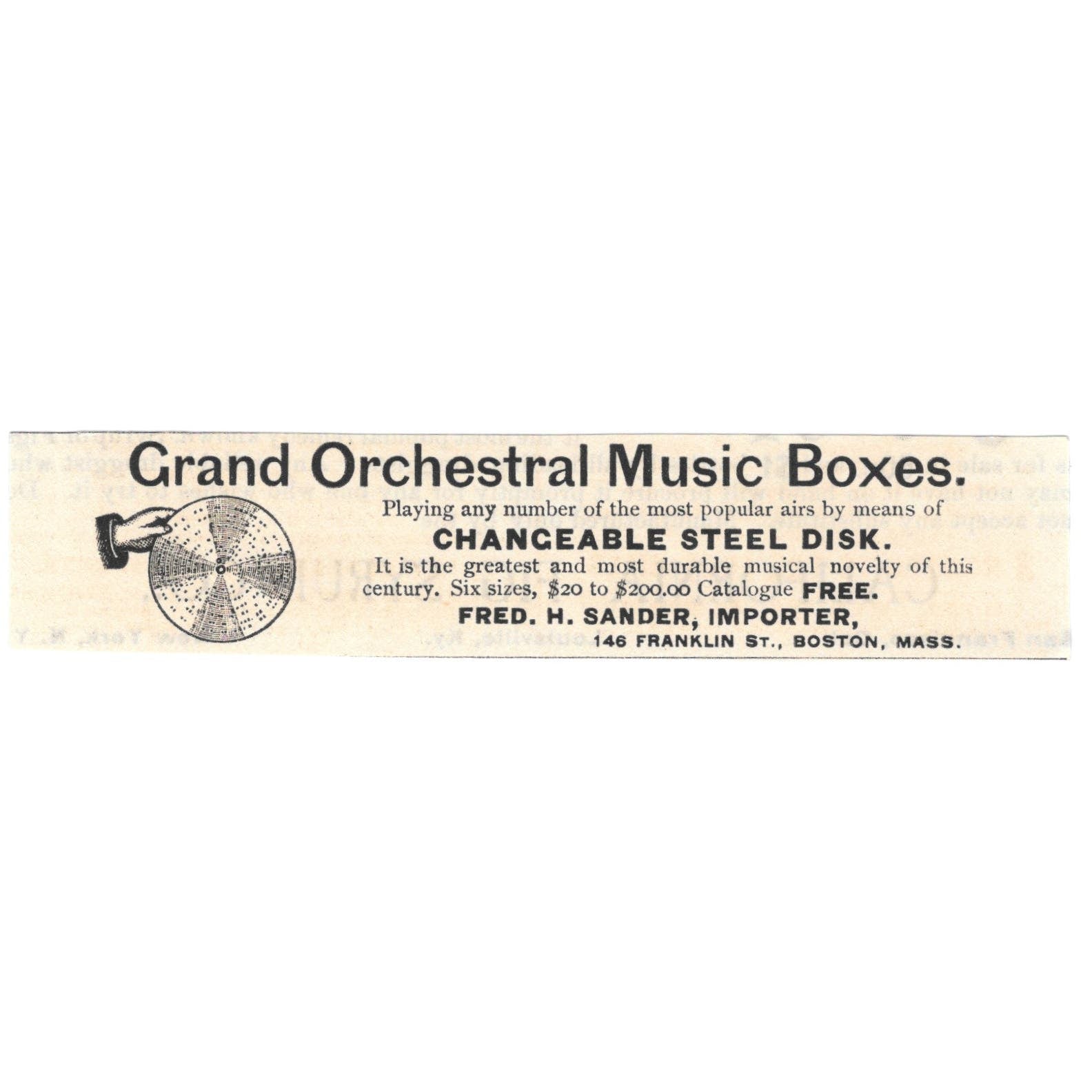 Grand Orchestral Music Boxes Fred H. Sander Importer Boston c1890 Victorian Ad AE8-CH13