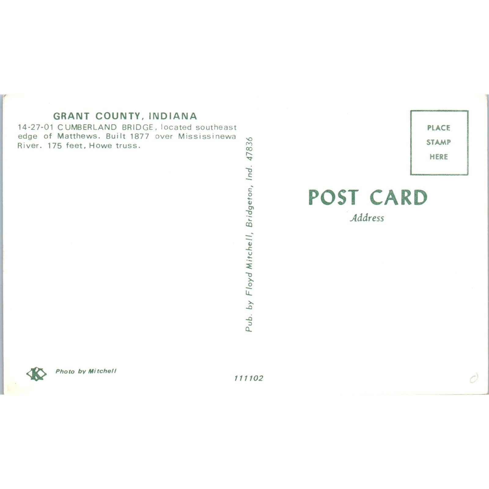 Grant County Cumberland Bridge IN Vintage Covered Bridge Postcard PC12