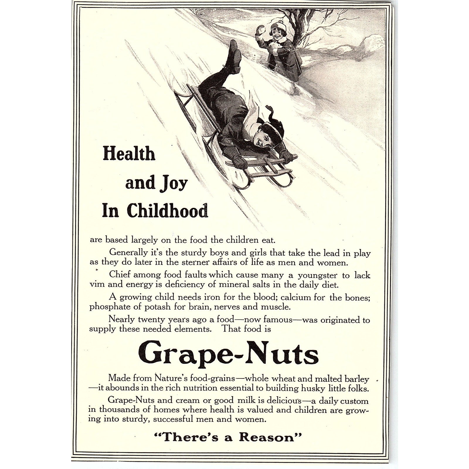 Grape-Nuts Health and Joy in Childhood Child on Toboggan Sled c1920 Ad AF8-8