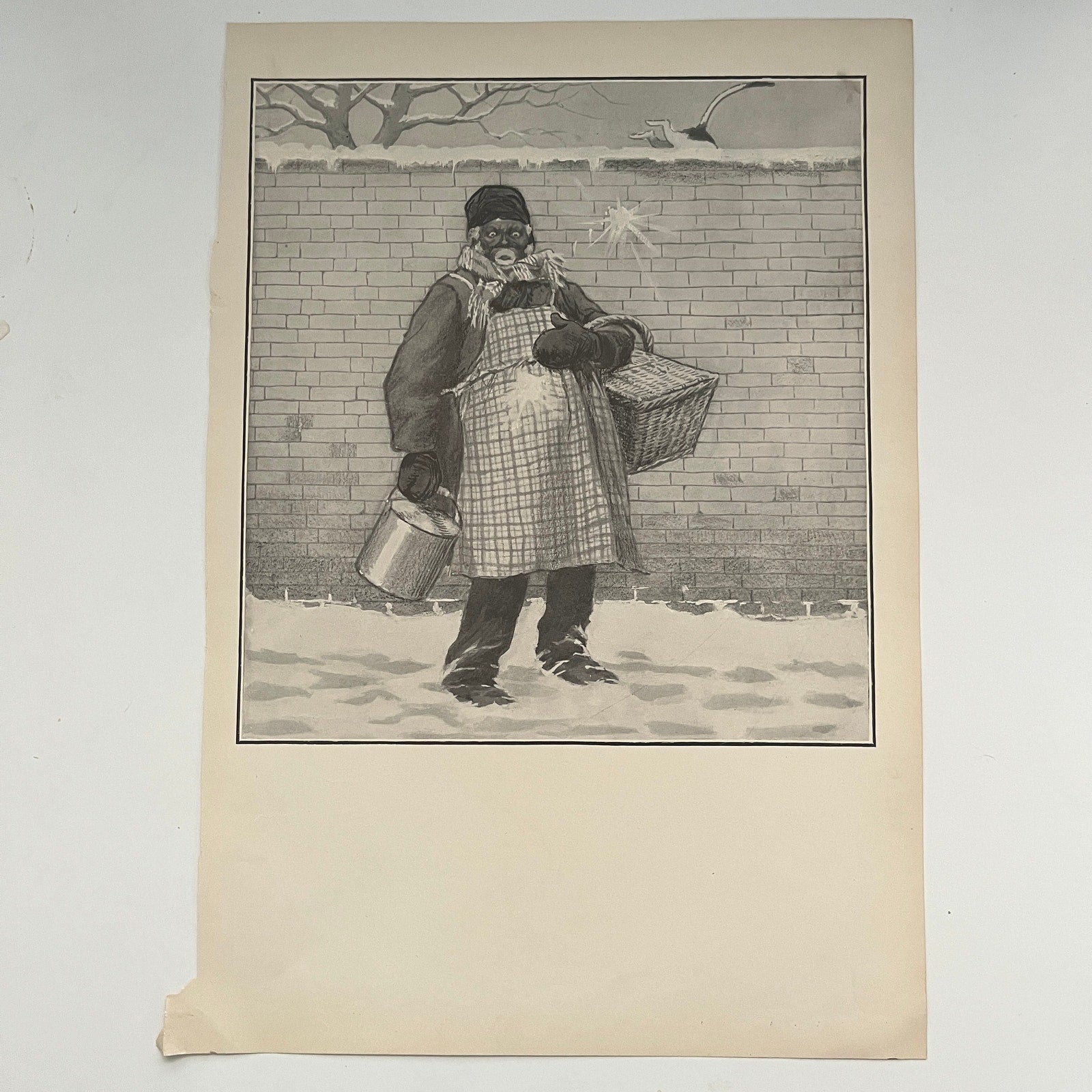 Has been cut unevenly, would benefit from being trimmed better. Reflected in the price. Measures Approximately 10x15". Original piece taken from 1904 A Book of Drawing - A.B. Frost. Back side has a description of a different piece, due to the way book was constructed. Has regular wear and tear you would expect from a piece this age. See pics for condition.