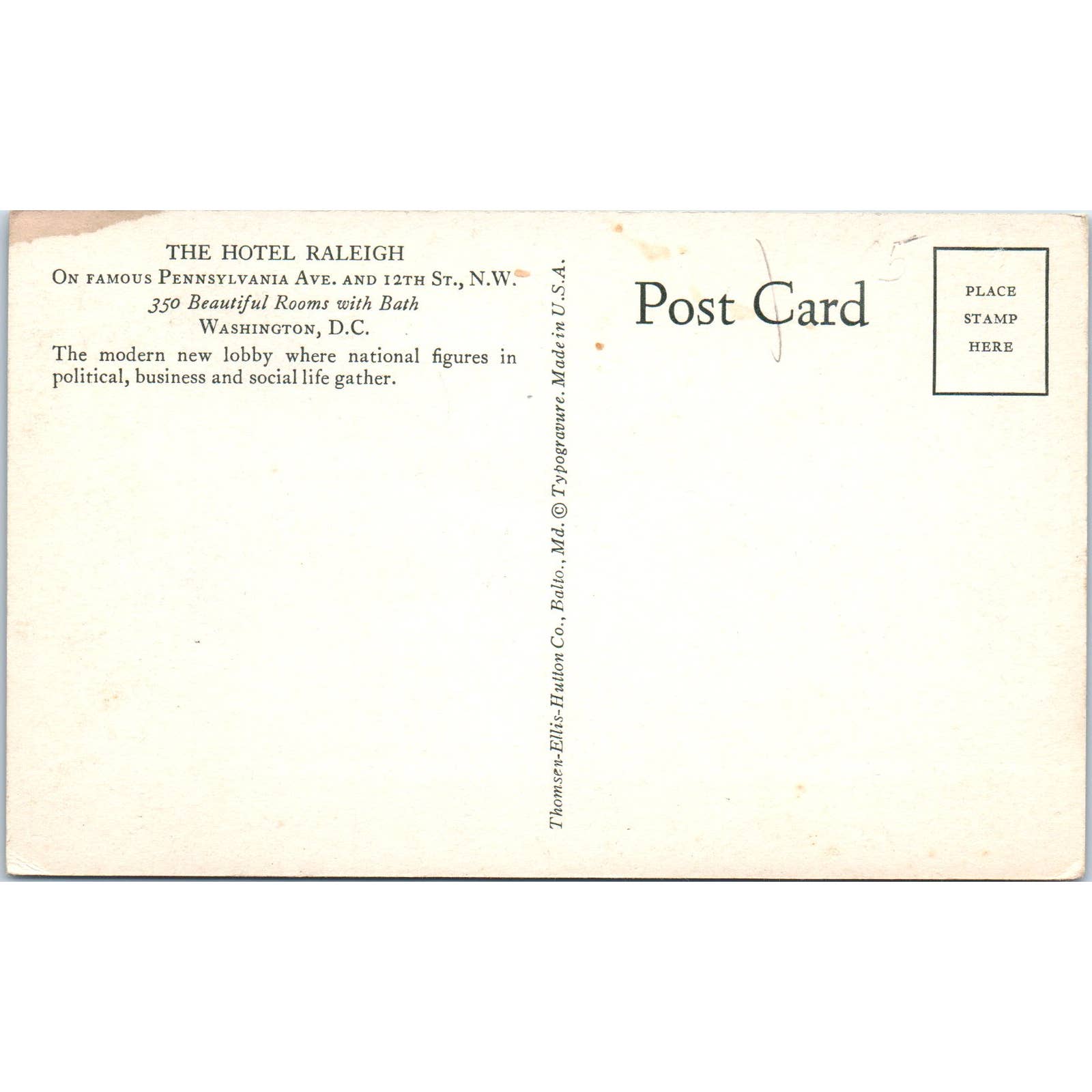 Hotel Raleigh Lobby Washington D.C. Original Postcard TK1-P2