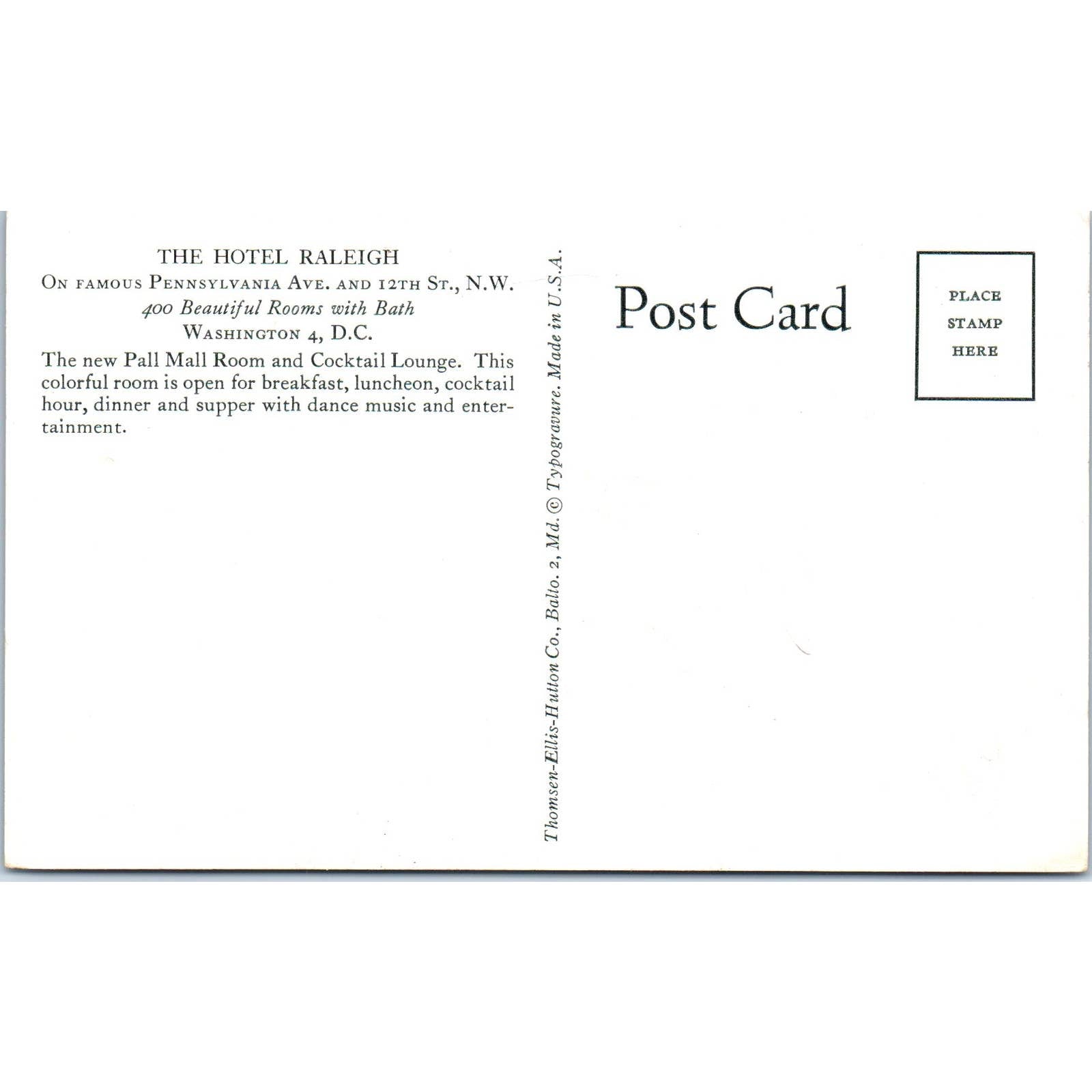 Hotel Raleigh Pall Mall Room Washington D.C. Original Postcard TK1-P2
