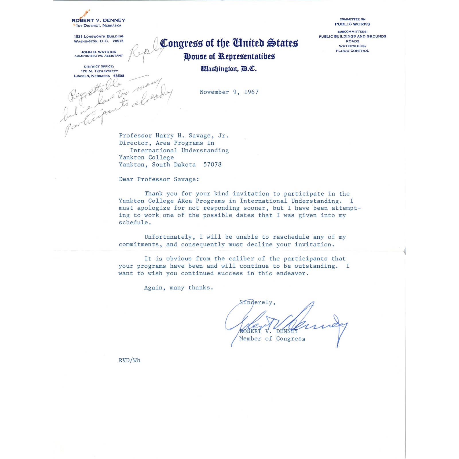 House of Representatives Official Letterhead Robert V. Denney Nov 1967 TK1-P6
