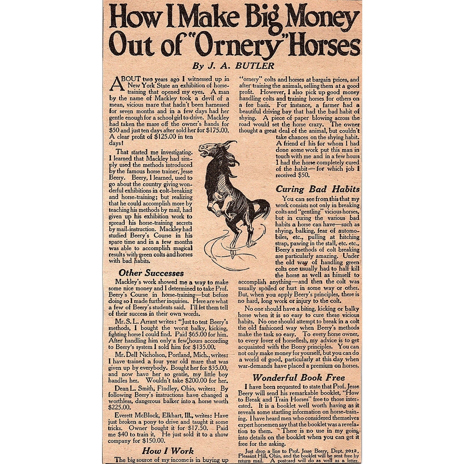 How I Make Big Money Out of Ornery Horses J.A. Butler Jesse Beery 1920 Ad AG2-6