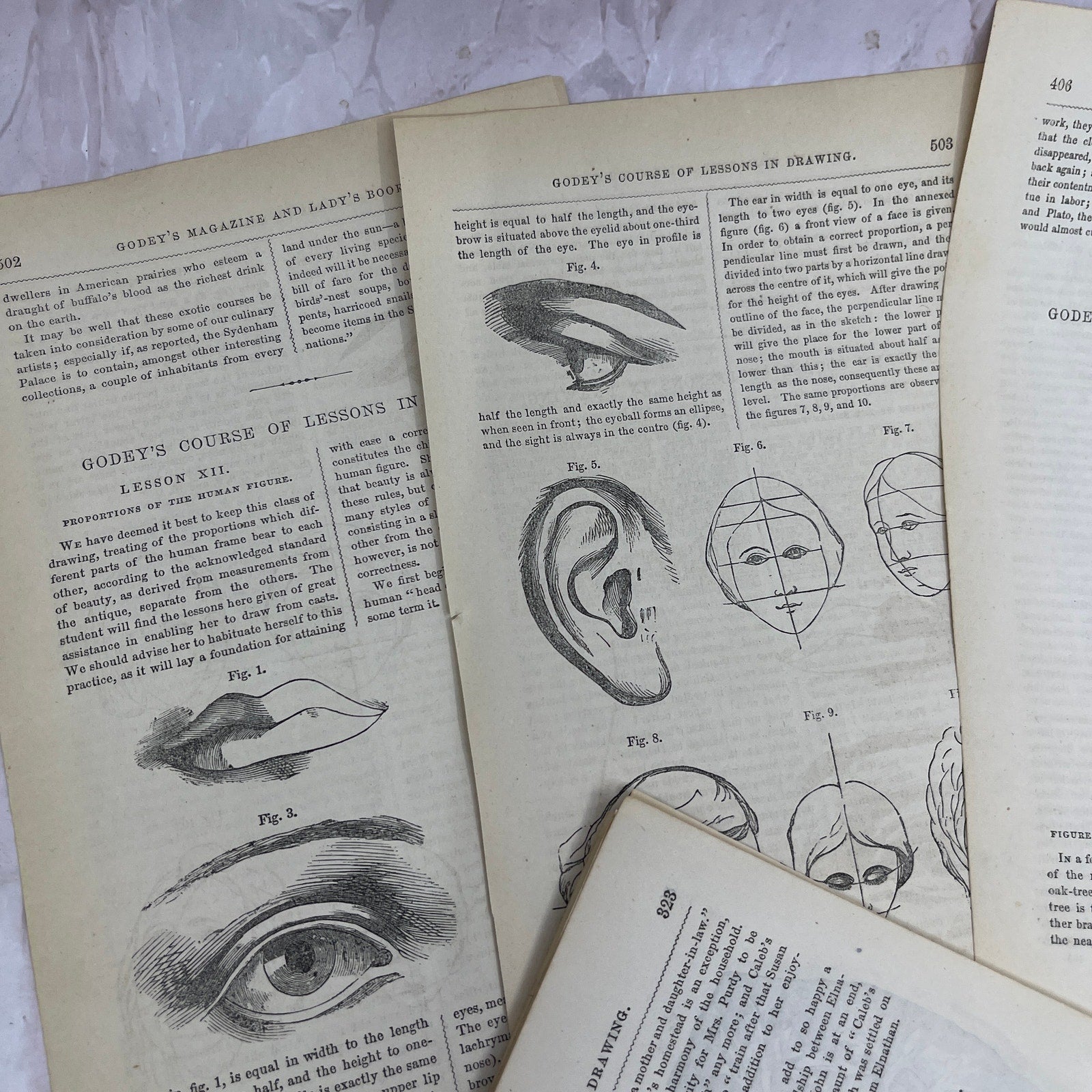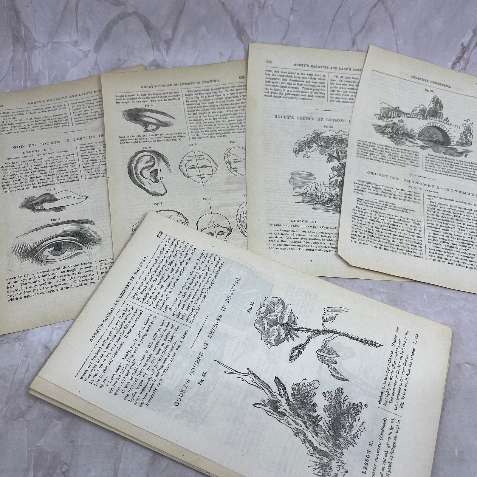 Huge Lot of Original Assorted Drawing Lessons From 1857 Godey's Book TH9-MG3