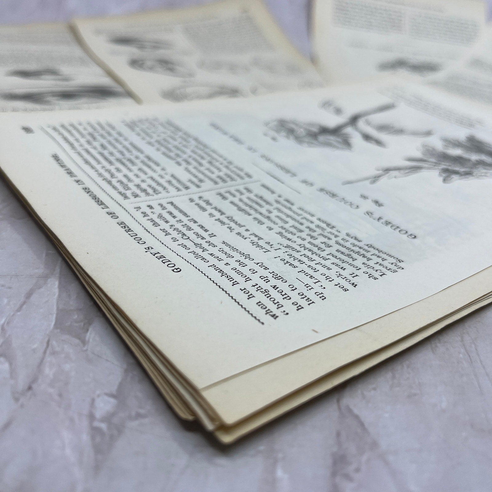 There is a large stack, pictured, I didn't count the whole thing. Original pieces taken from the 1857 Godey's Lady's Book, may have small blemishes, tears, etc. from use. Please review pictures closely. Measures approx 6x9.5".