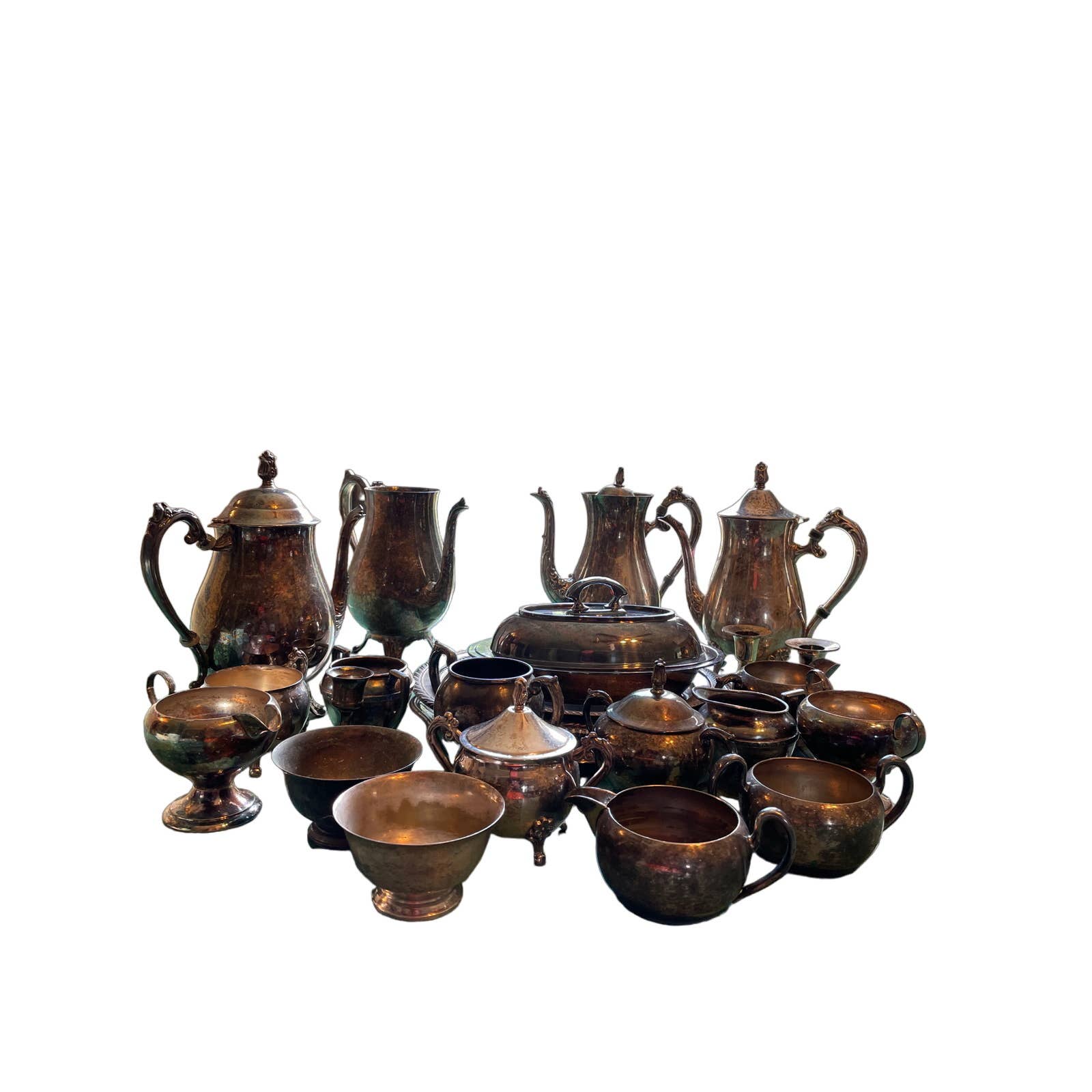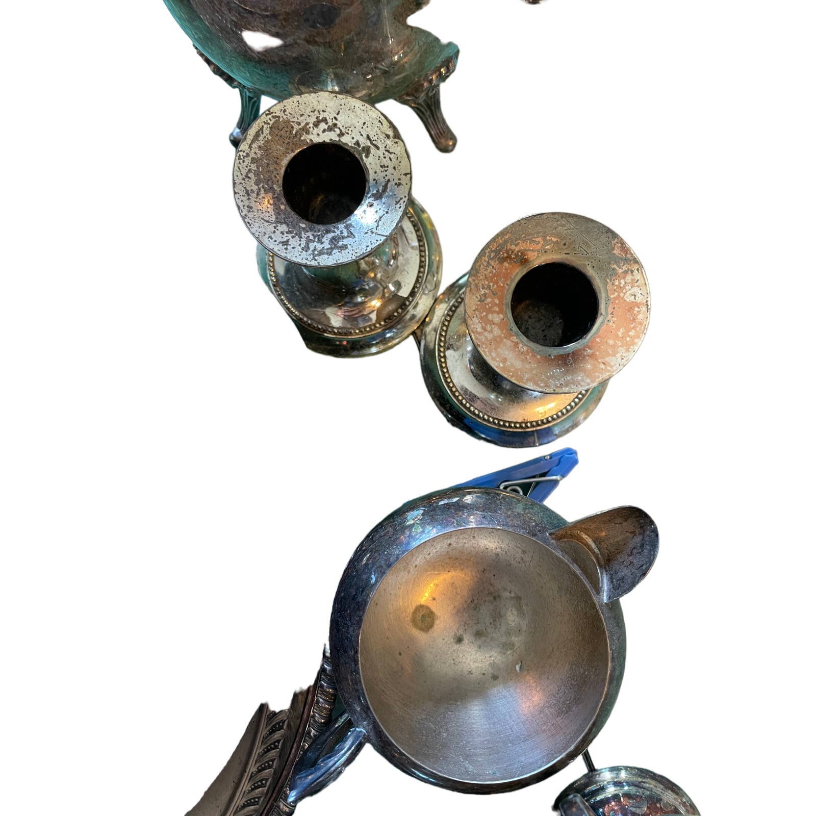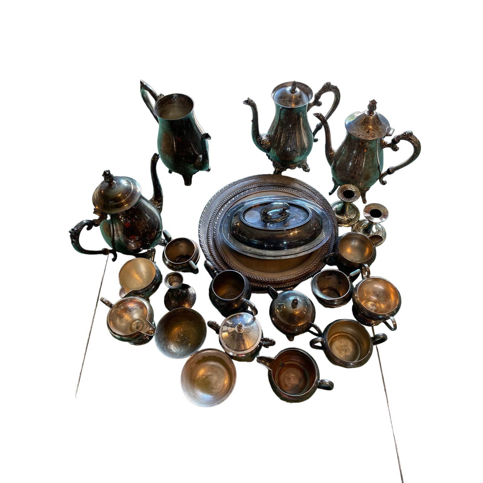 Lovely assortment of silver plate items. Could be some Sterling and the matching candlesticks don’t have any markings so not sure they’re silver plate but look like they could be. Nicely tarnished/aged teapots, creamers, sugars/sugar bowls, platters (6 total), etc. Some pieces are missing their lids…two of the coffee pots have broken lid hinges and one has an incorrect sized lid. A few items have spots from price stickers people put on them that have been since cleaned off, leaving marks. Overall good condition. Good for staging, resale or collectors. Over 21 pounds.