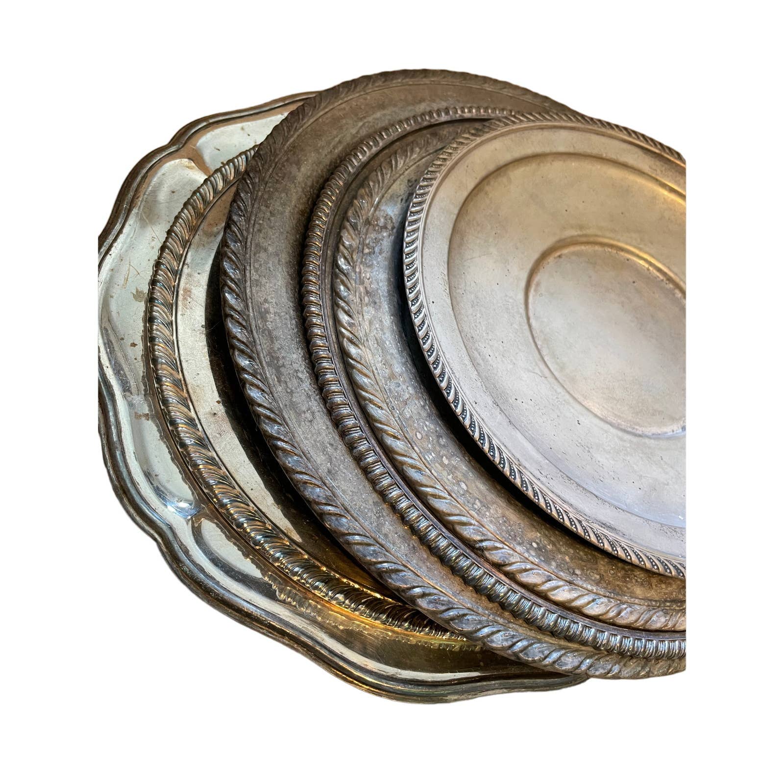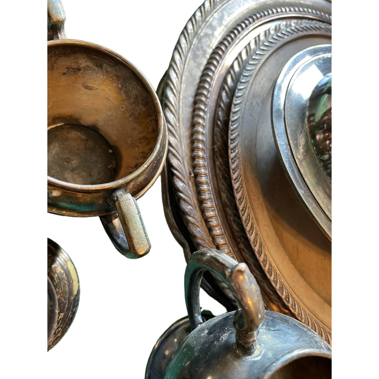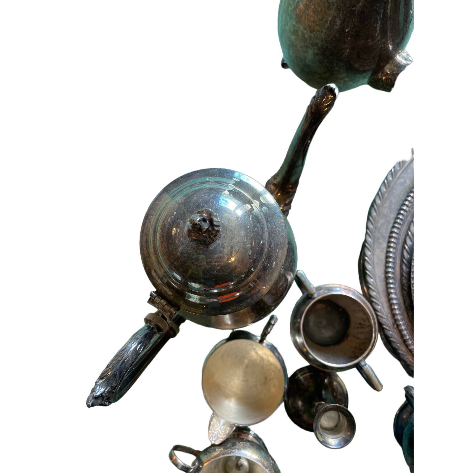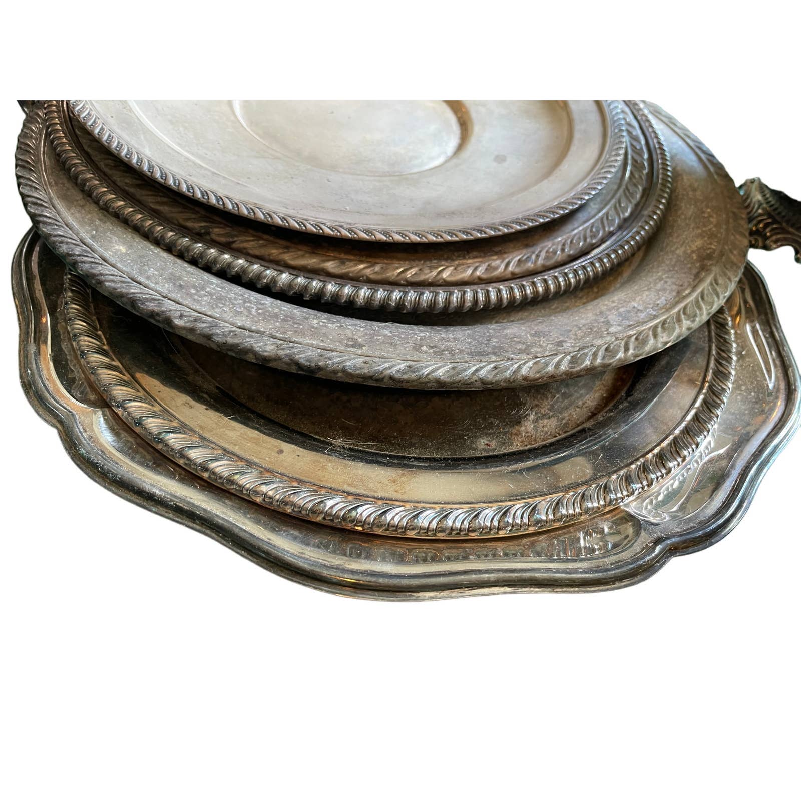 Lovely assortment of silver plate items. Could be some Sterling and the matching candlesticks don’t have any markings so not sure they’re silver plate but look like they could be. Nicely tarnished/aged teapots, creamers, sugars/sugar bowls, platters (6 total), etc. Some pieces are missing their lids…two of the coffee pots have broken lid hinges and one has an incorrect sized lid. A few items have spots from price stickers people put on them that have been since cleaned off, leaving marks. Overall good condition. Good for staging, resale or collectors. Over 21 pounds.
