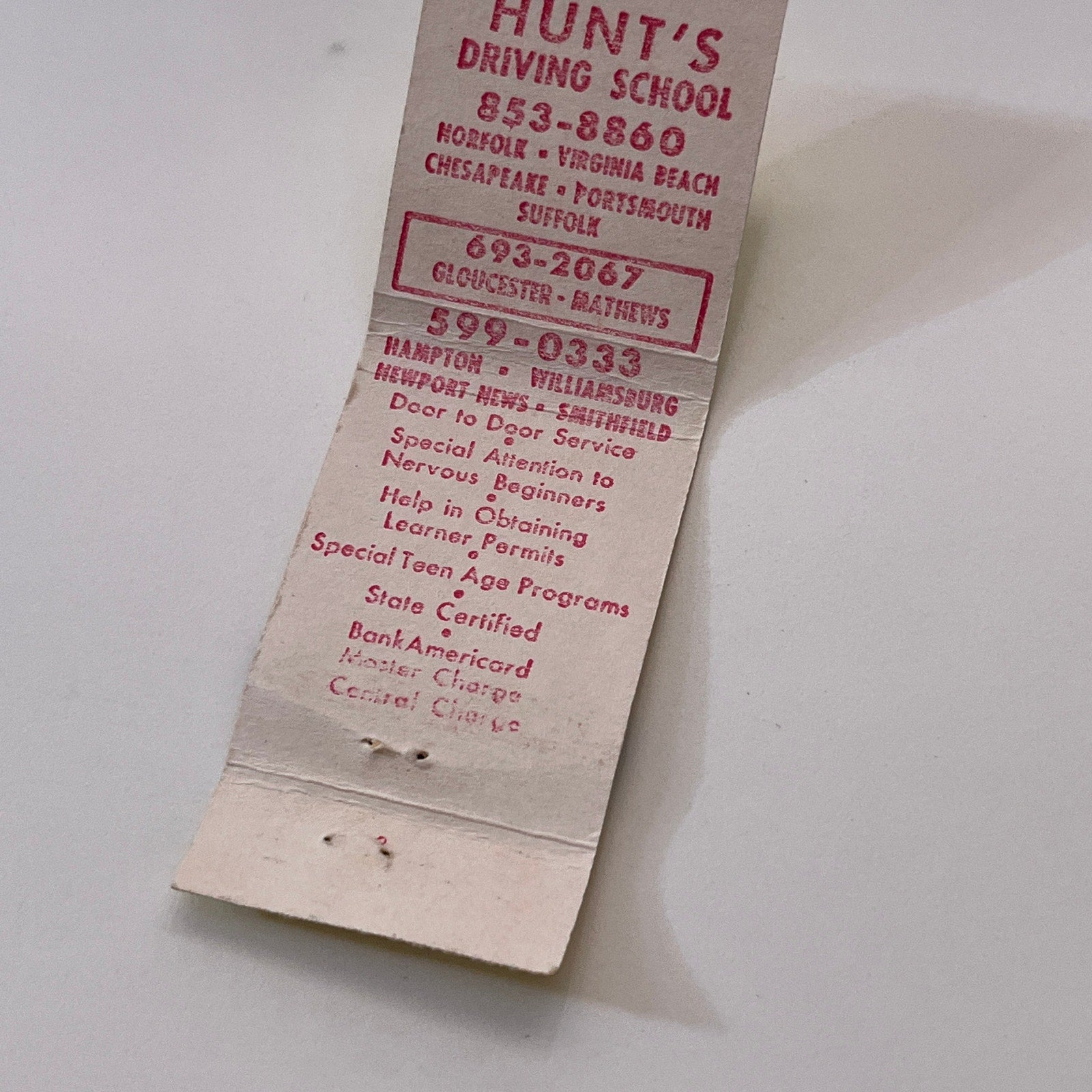 Hunt's Driving School Peninsula Tidewater Vintage Matchbook Cover TB6-MB1-10