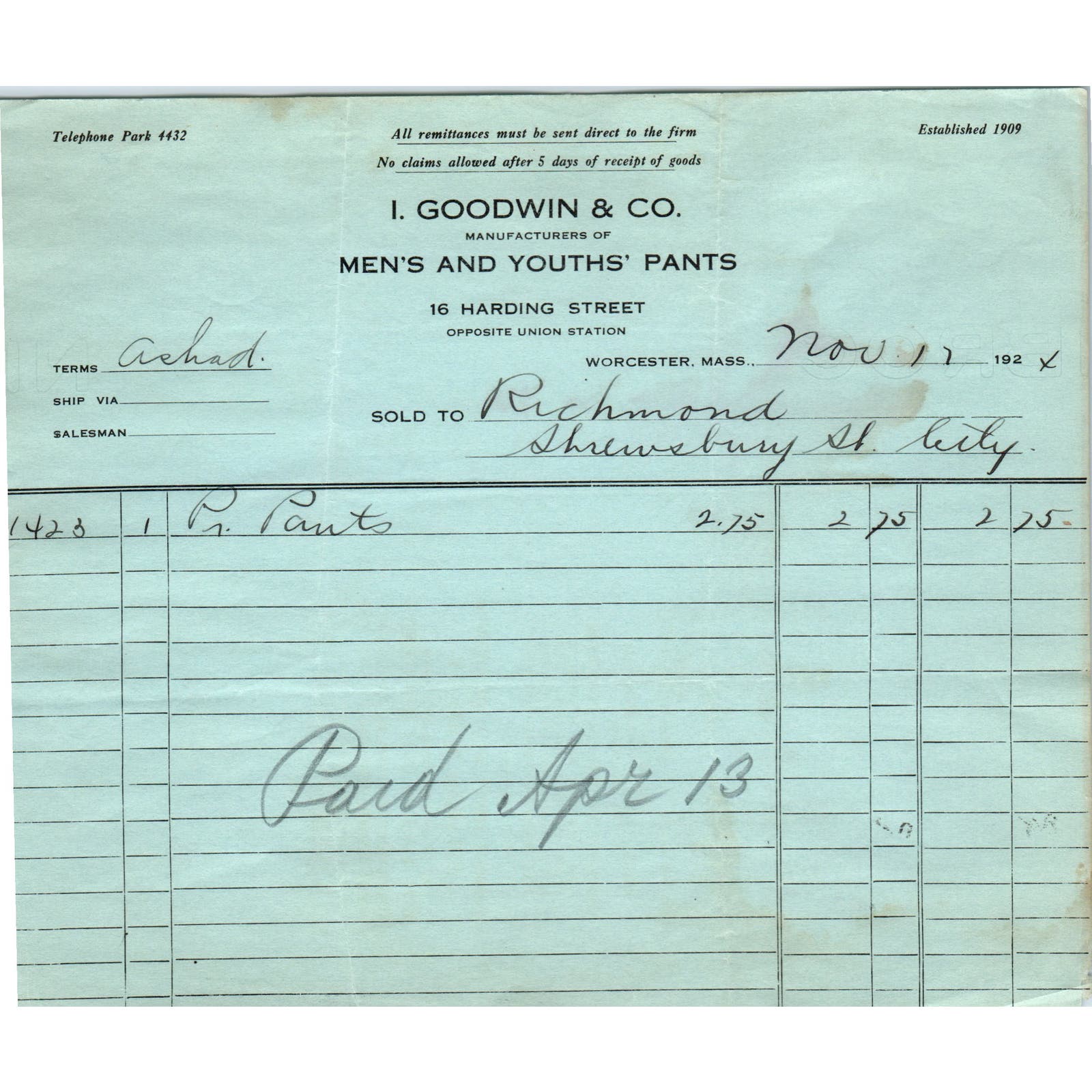 I. Goodwin & Co Men's Pants Worcester MA 1924 Original Billhead Letterhead Receipt D8-LL