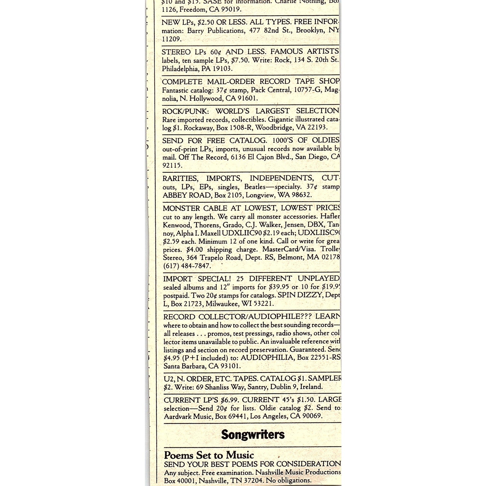 Measures approx 2.5x4". Size is approximate. Original piece taken from a 1984 Rolling Stone magazine. Has regular wear and tear you would expect from a piece this age. See pics for condition.