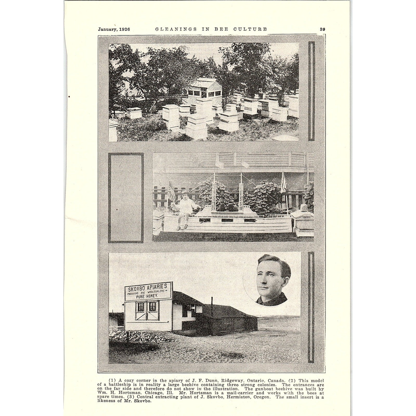 J.F. Dunn Apiary Ridgeway Ontario, Wm H Hortsman Gunboat Beehive Chicago, J.Skovbo Extracting Plant Hermiston OR Beekeeping Photos 1926 Article AG3-9