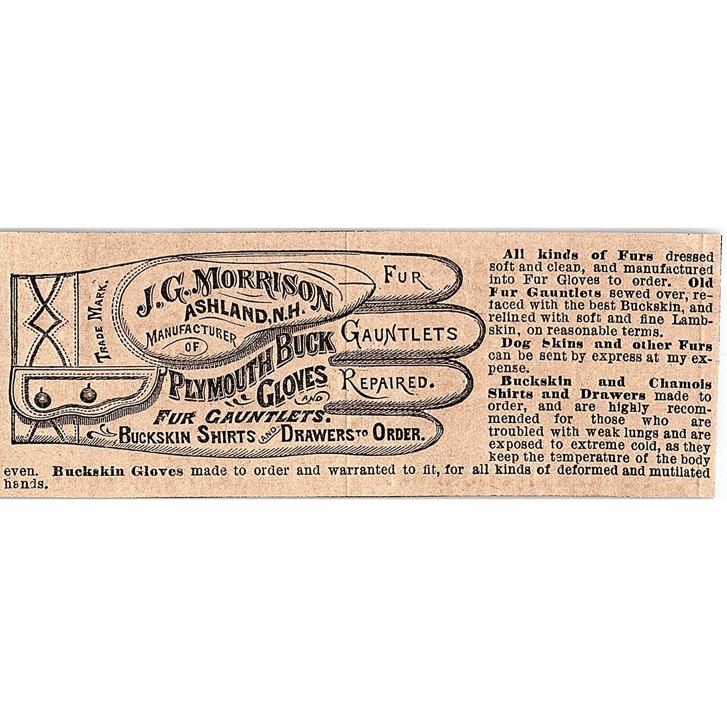J.G. Morrison Plymouth Buck Gloves Ashland NH 1878 Ad AG2-M13
