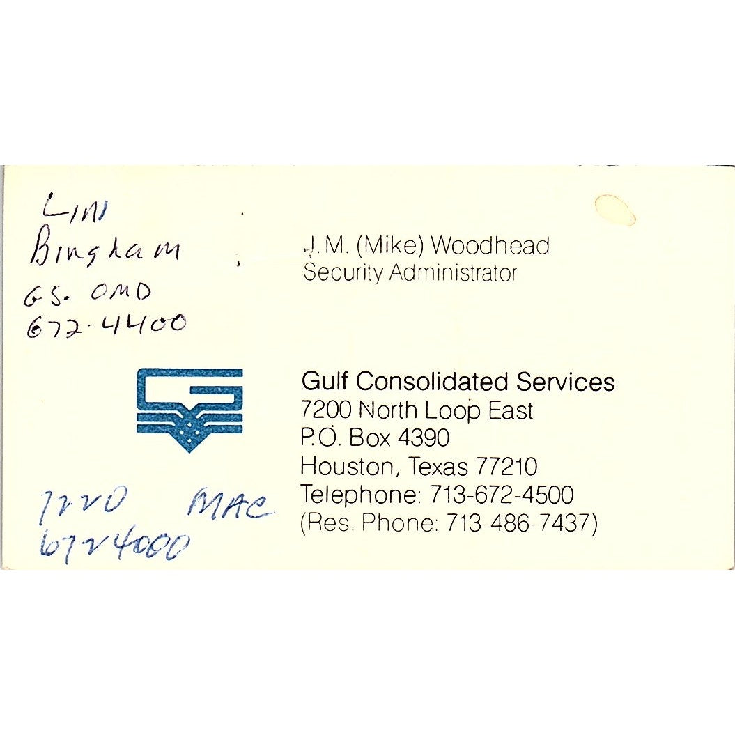 J.M. Mike Woodhead Gulf Consolidated Services Houston Vtg Business Card SD9-B7