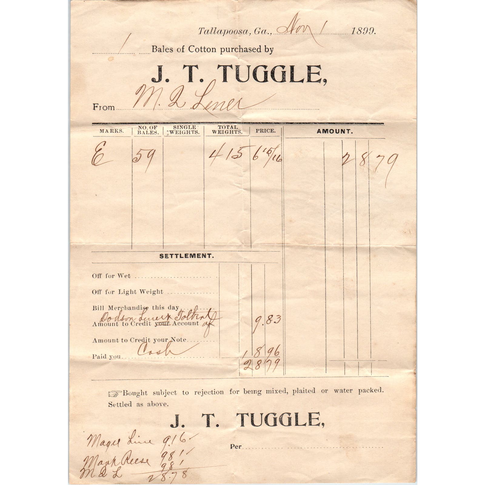 J.T. Tuggle Cotton Tallapoosa GA 1899 Original Billhead Letterhead Receipt D8-LL-2