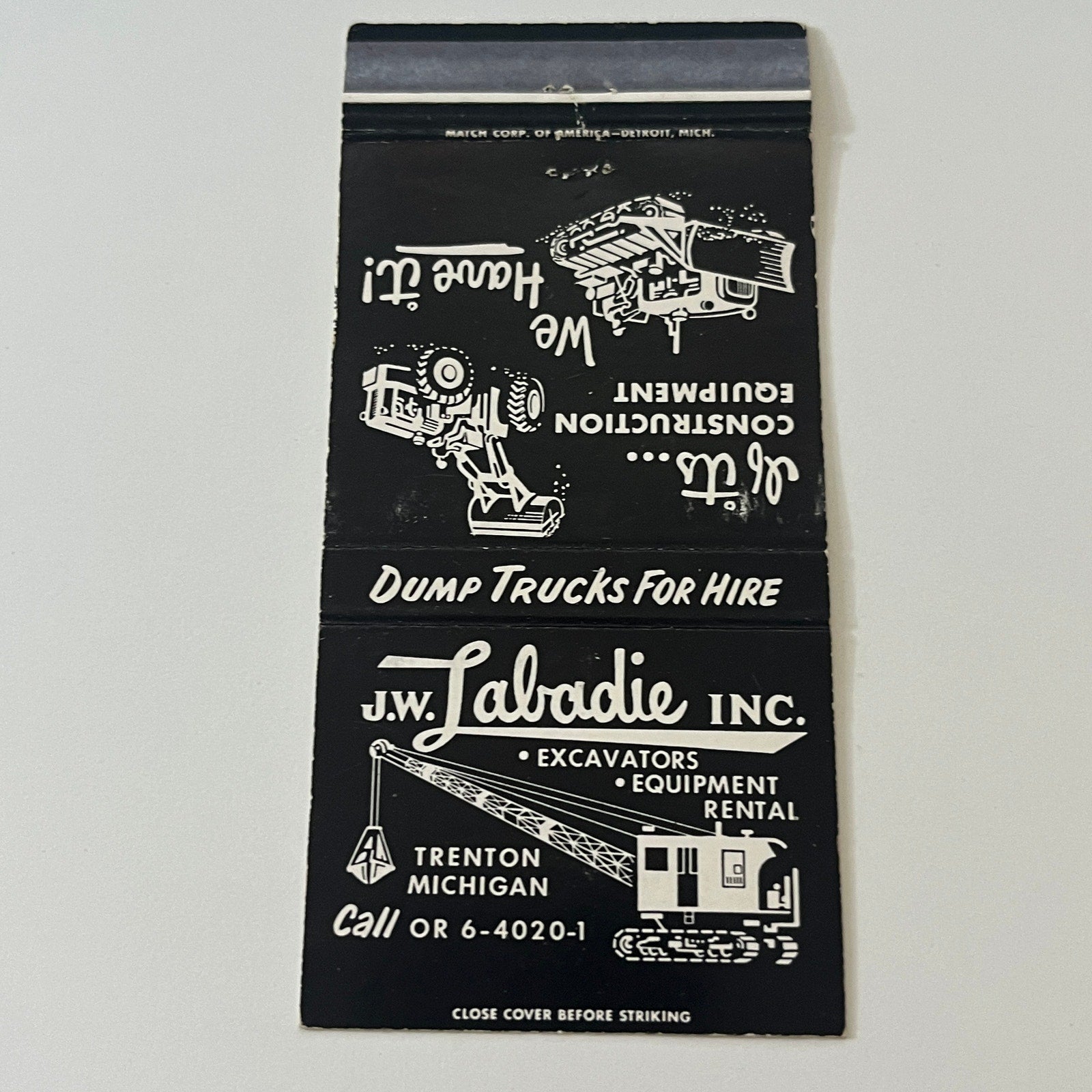 J.W. Labadie Inc Construction Equipment Trenton MI Vintage Matchbook Cover TB6-MB2-6