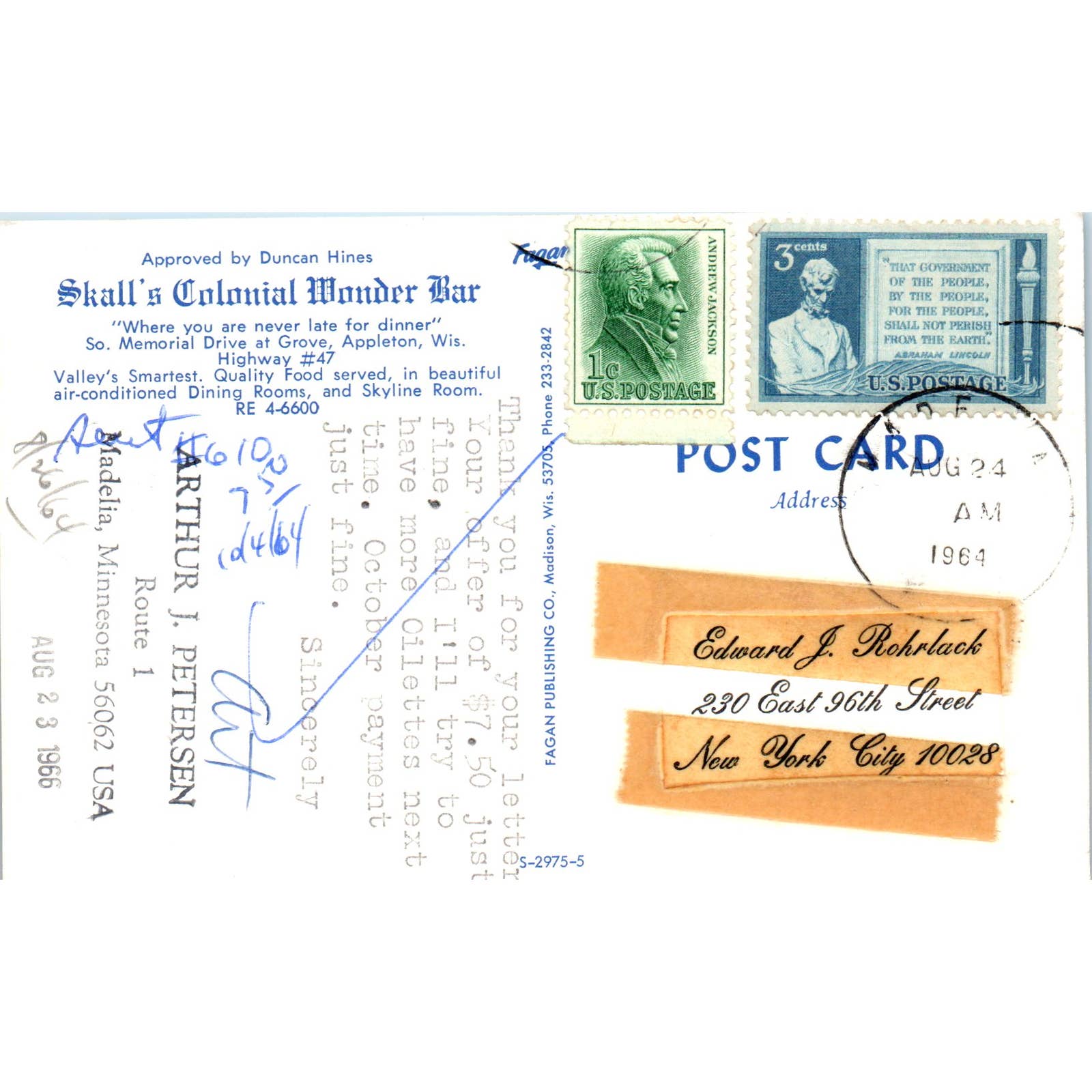 Jack Skall's Colonial Wonder Bar Appleton 1964 WI Original Postcard TJ9-P3