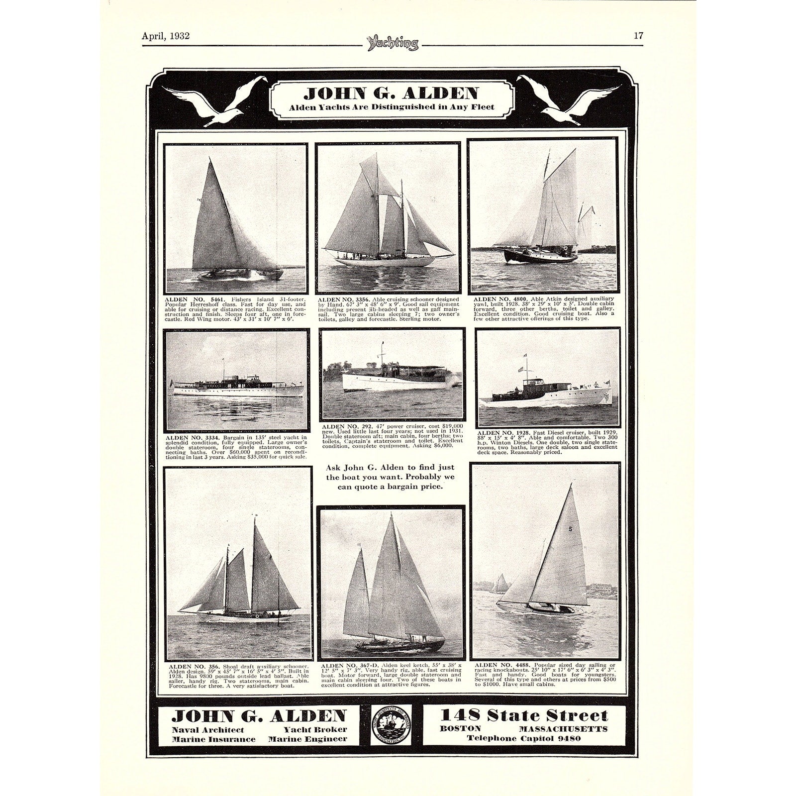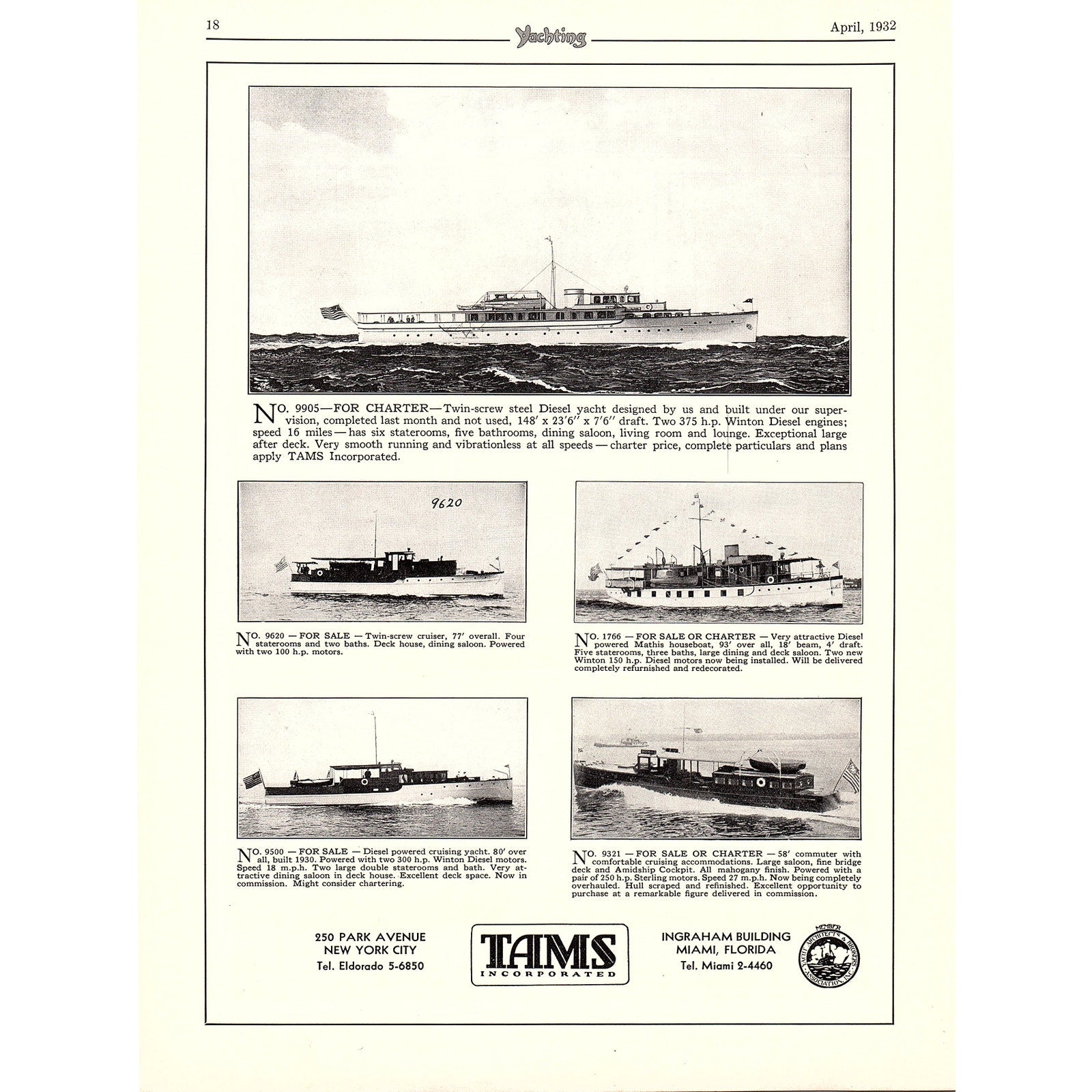 John G. Alden Yachts Boston, Tams Incorporated Yachts Miami FL 1932 Ad V1-4