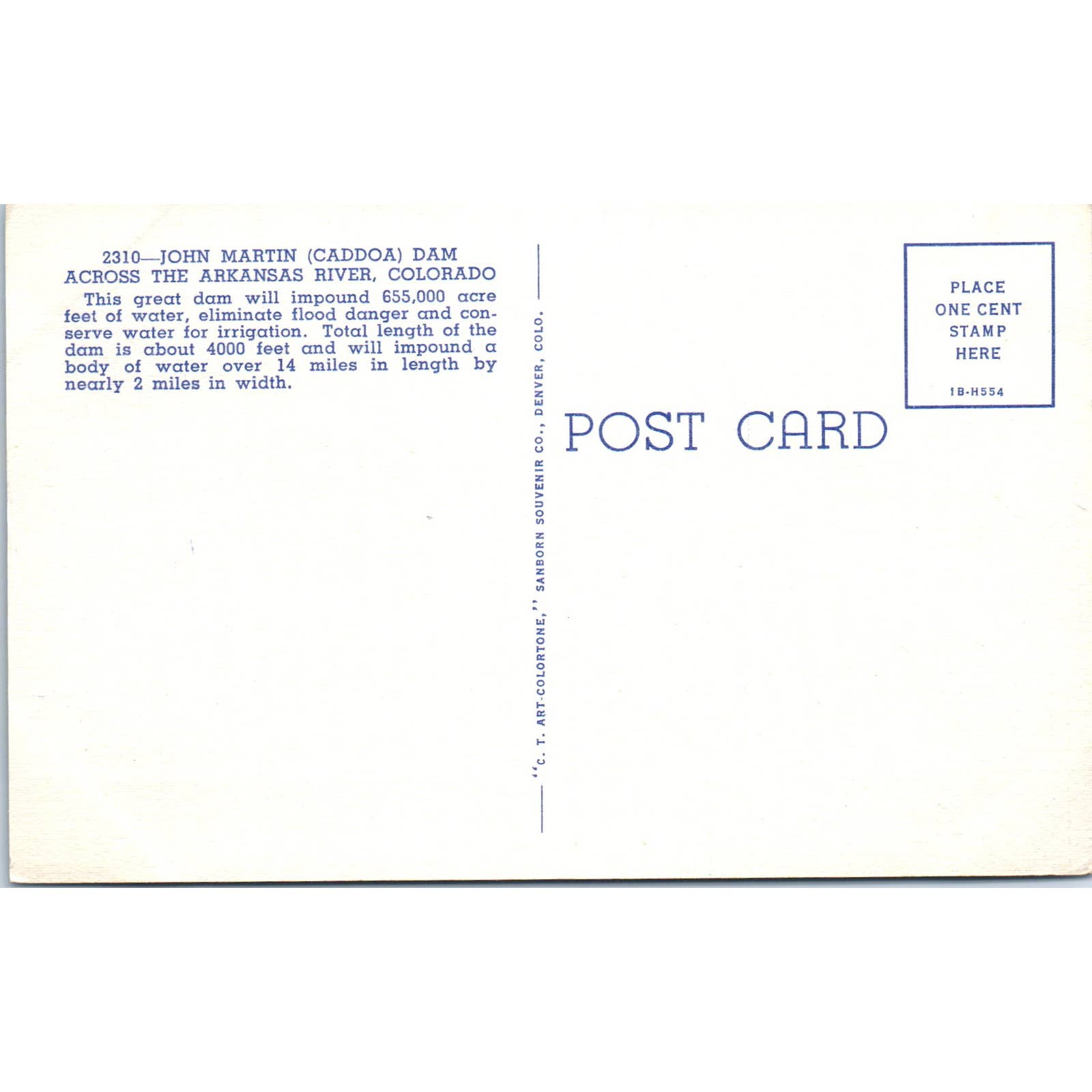 John Martin Caddoa Dam Arkansas River Colorado Original Postcard TK1-29