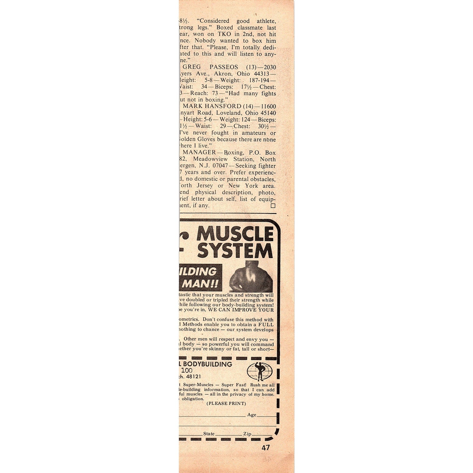Measures approximately 2.5x11". Original piece pulled from 1974 World Boxing Magazine. See pics for condition.