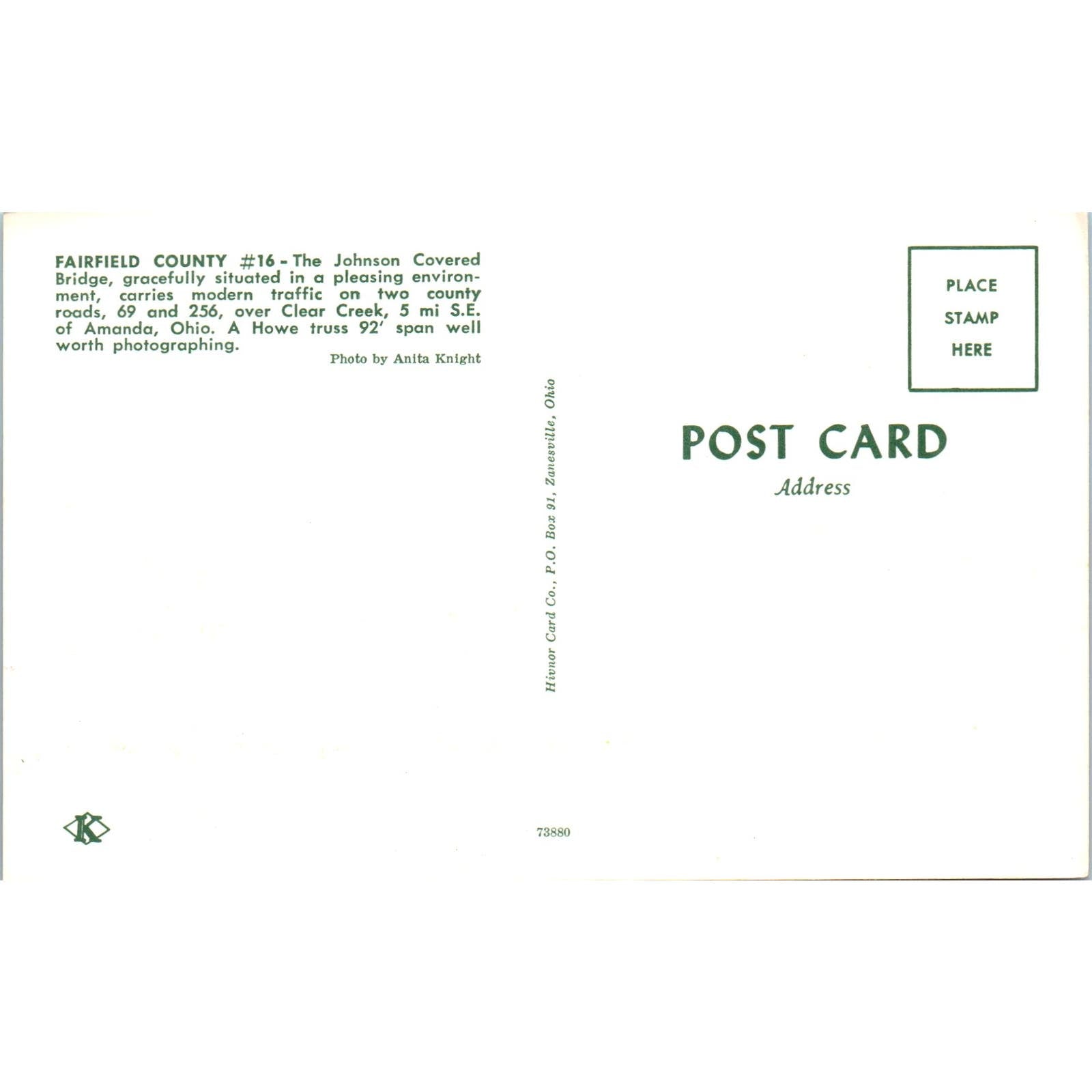 Johnson Covered Bridge Fairfield County #16 Amanda Ohio Covered Bridge Postcard PB11