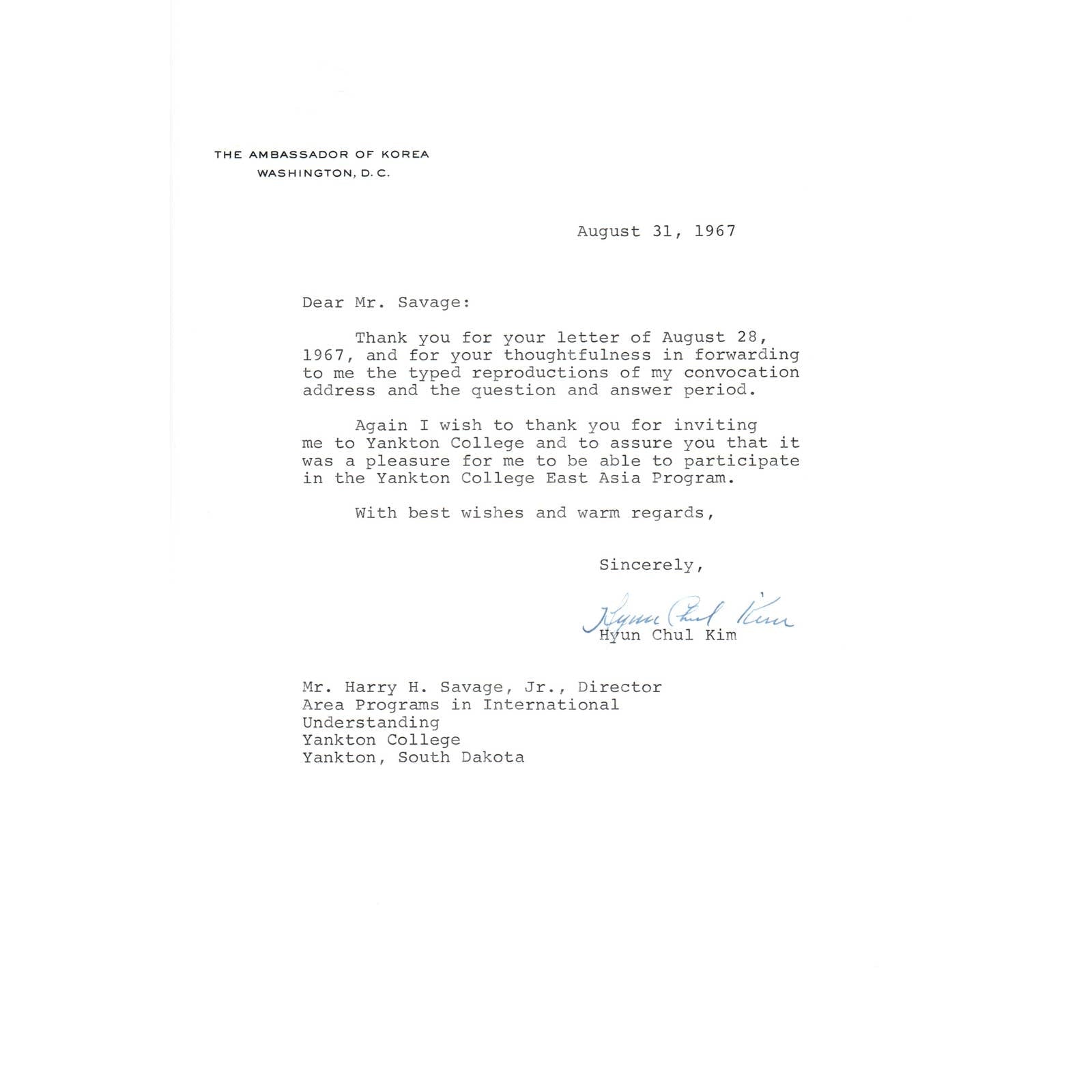 Korean Ambassador to the US Letterhead Memo Hyun Chul Kim 8/31/67 TK1-P9