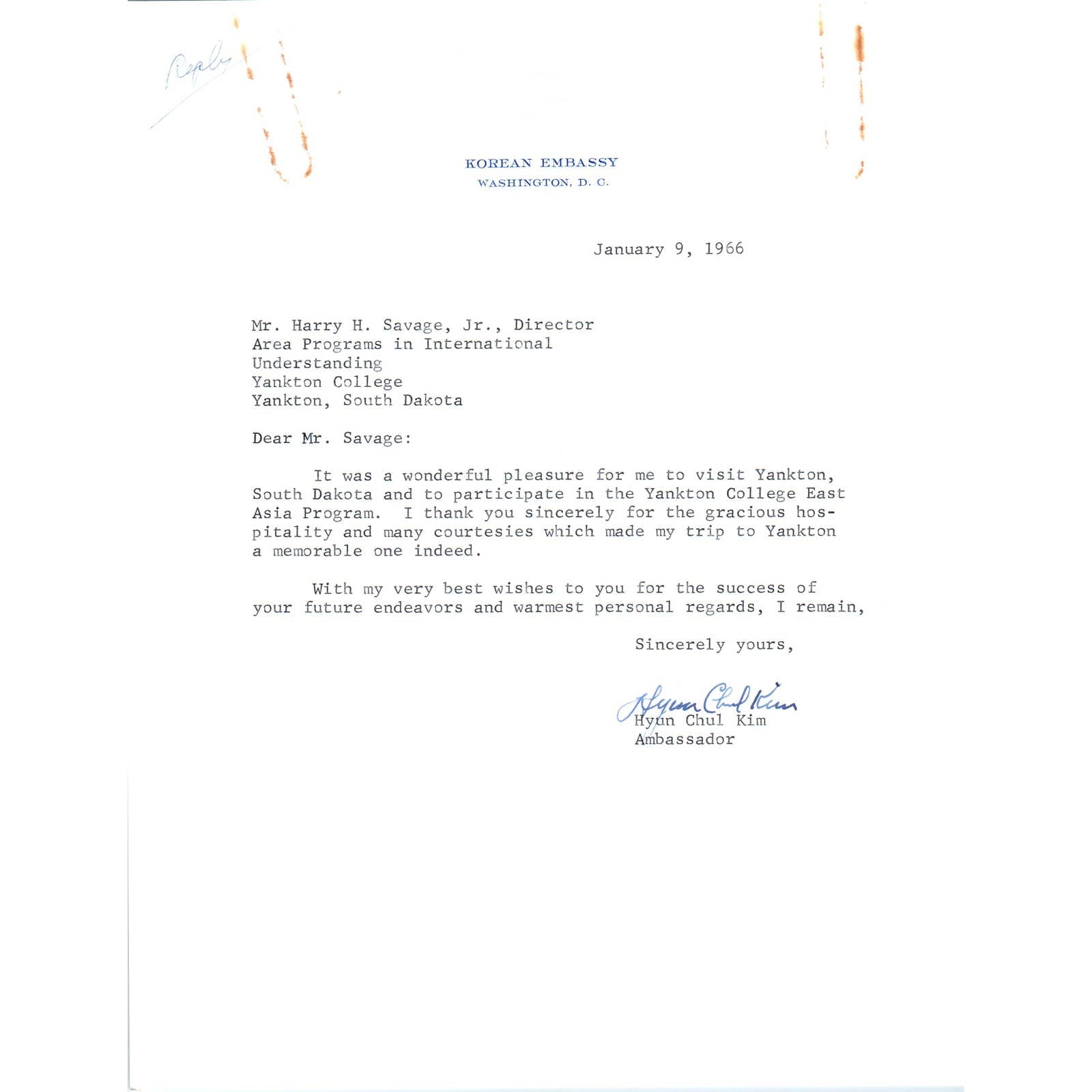 Korean Embassy Letterhead Memo Hyun Chul Kim 1/29/66 TK1-P9