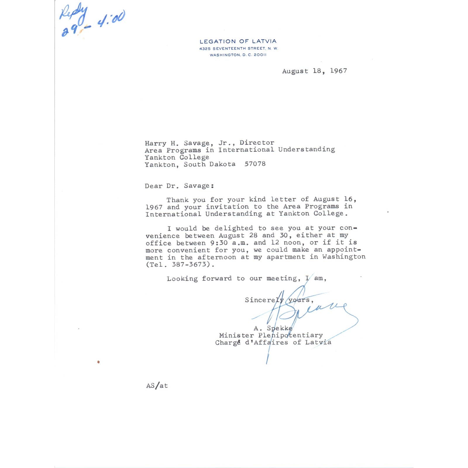 Legation of Latvia Official Letterhead Memo A. Spekke Aug 7 1968 TK1-P8