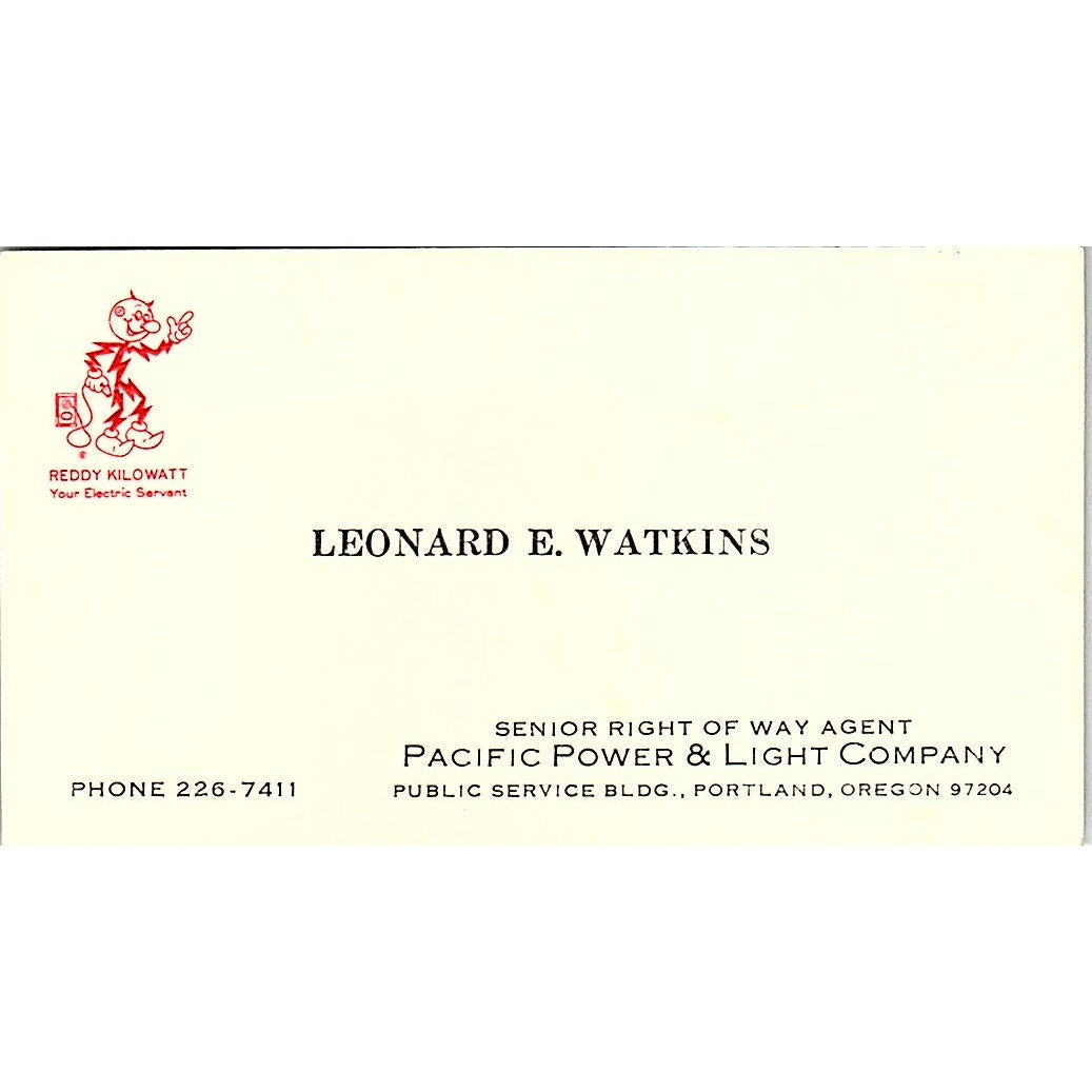 Leonard E Watkins Reddy Kilowatt Pacific Power & Light Portland Vintage Business Card SC9-B13