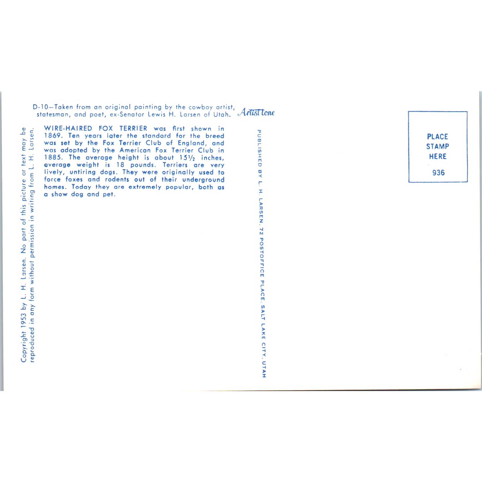 Lewis H. Larsen 1953 Wire Haired Fox Terrier Painting Original Postcard TK1-27