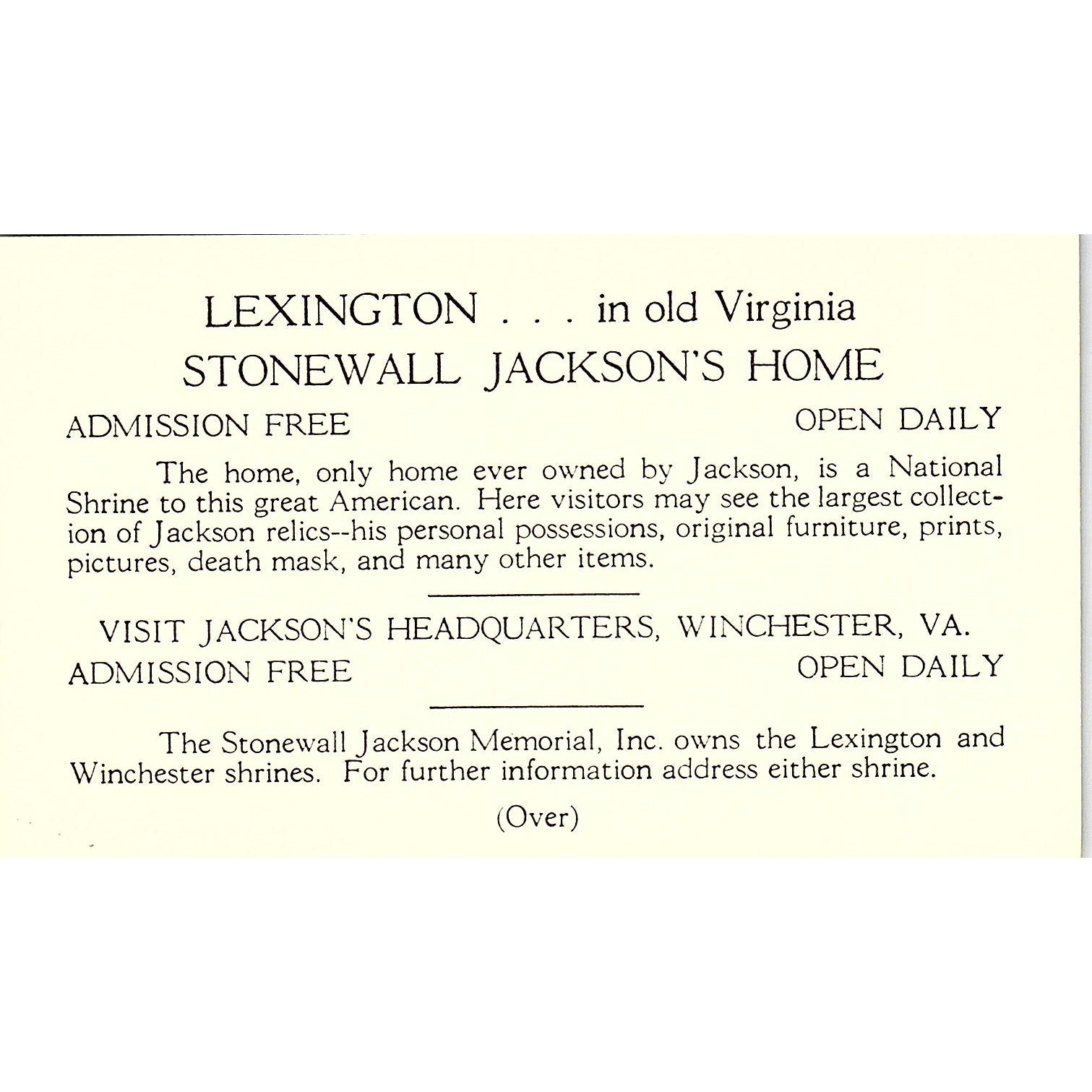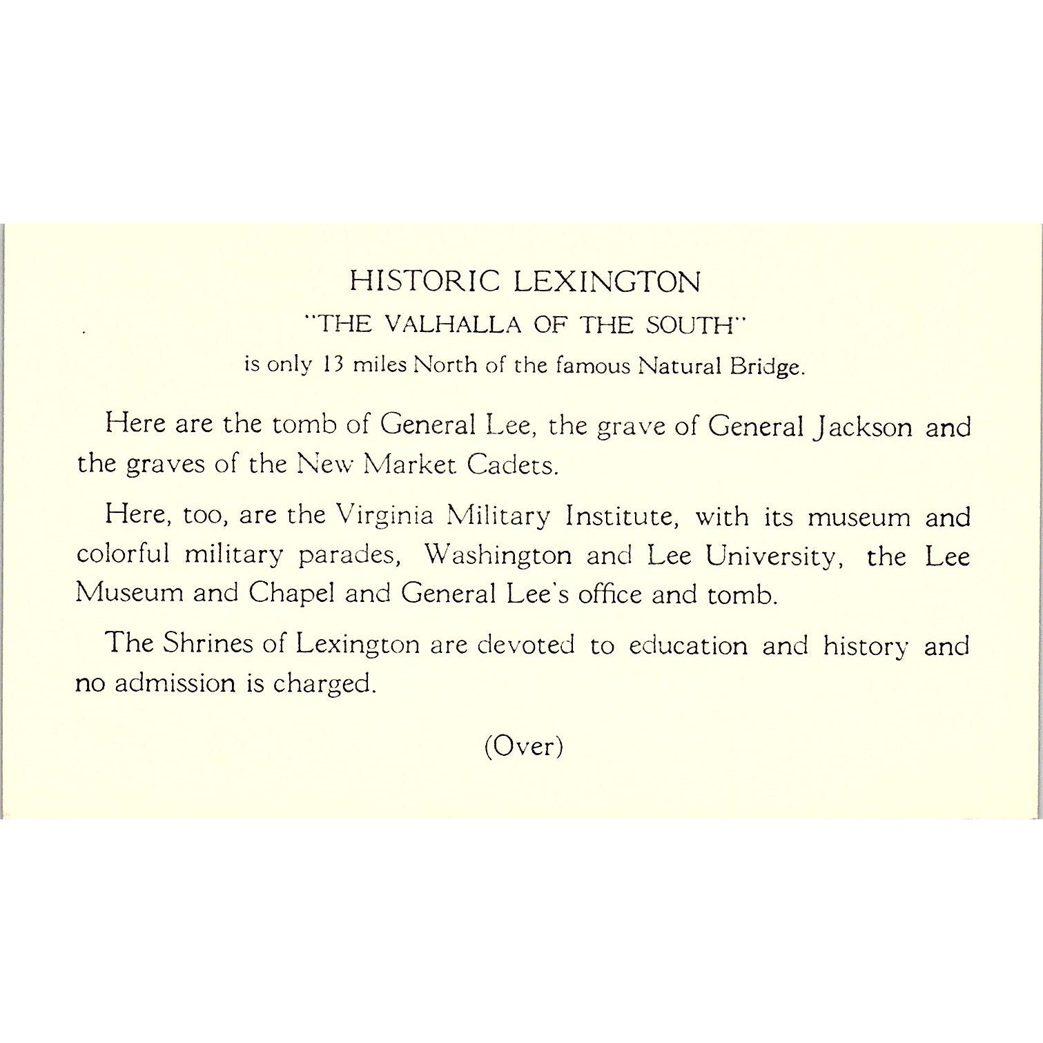 Lexington in Old Virginia Jackson's Home Winchester VA Vintage Leaflet TH2-TB3