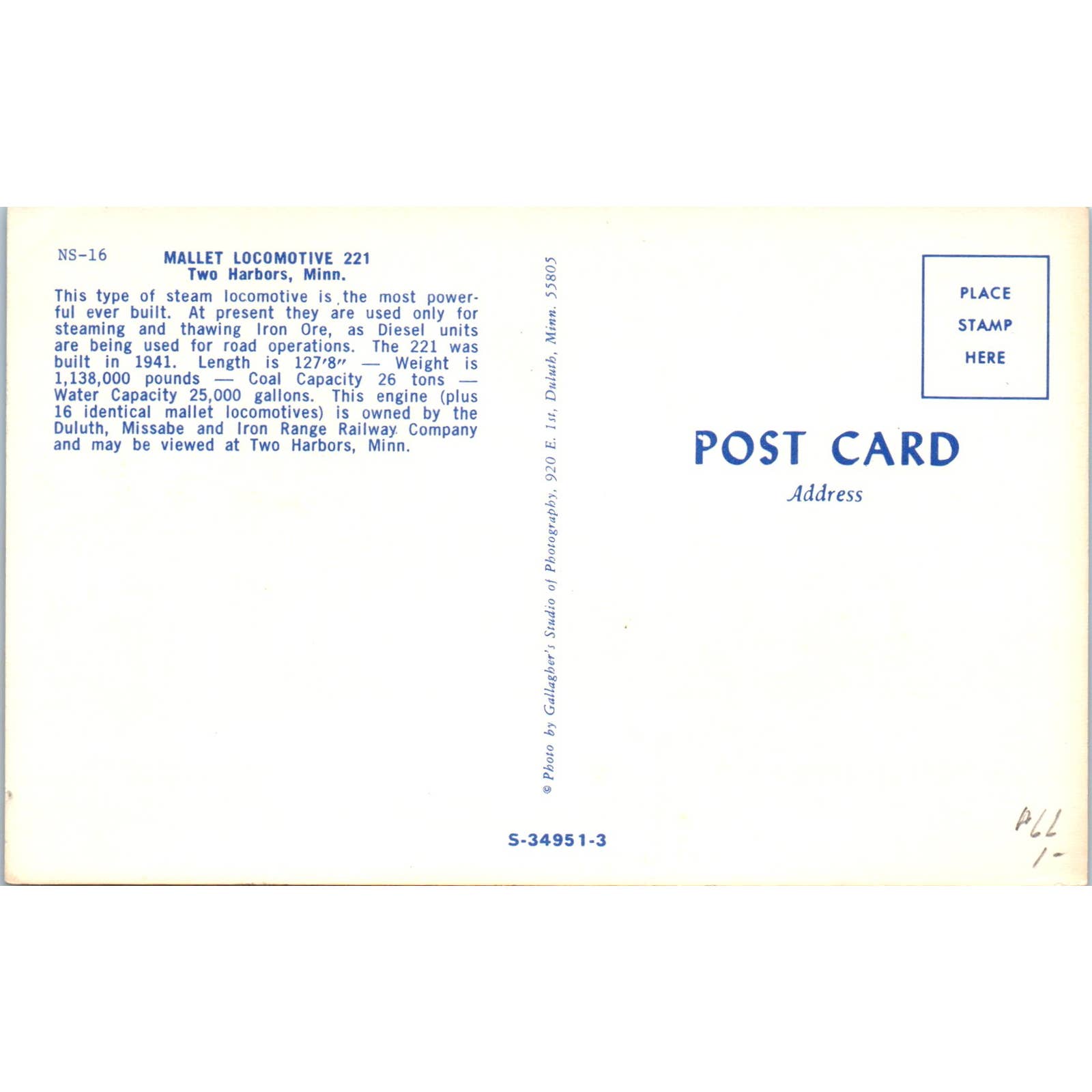 Mallet Locomotive 221 Two Harbors Minnesota Original Postcard TK1-P20