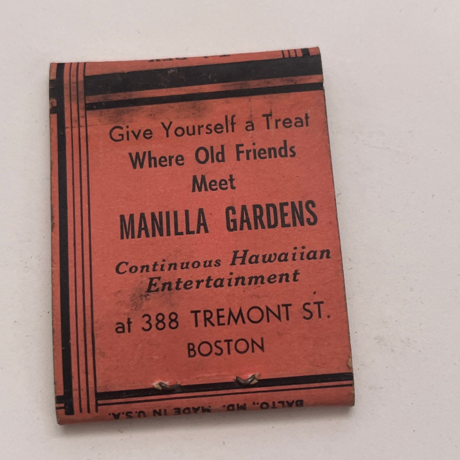 Manilla Gardens Hawaiian Entertainment Boston Vintage Matchbook Cover TB8-MB2-4
