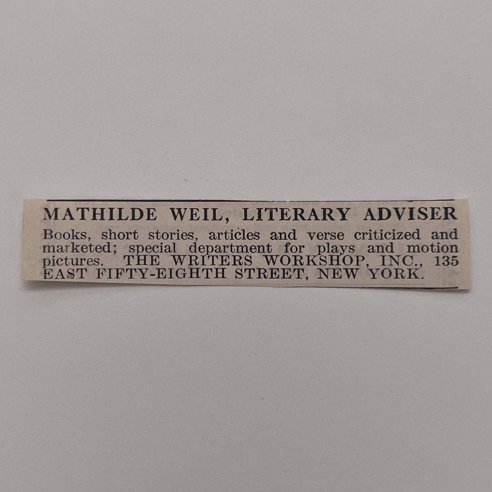 Mathilde Weil Literary Adviser The Writers Workshop Inc NY 1926 Ad AG3-S8