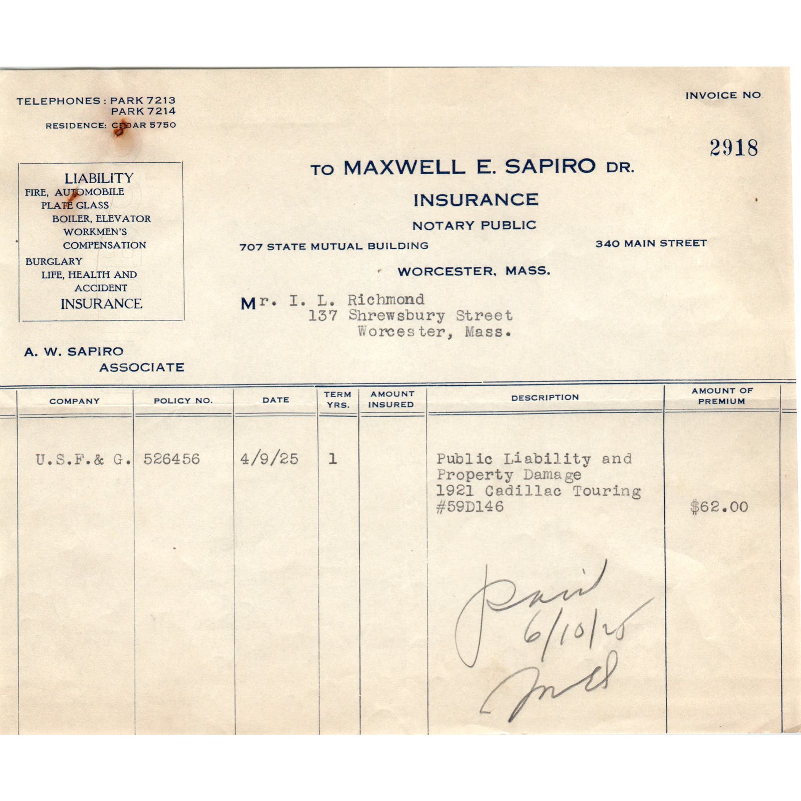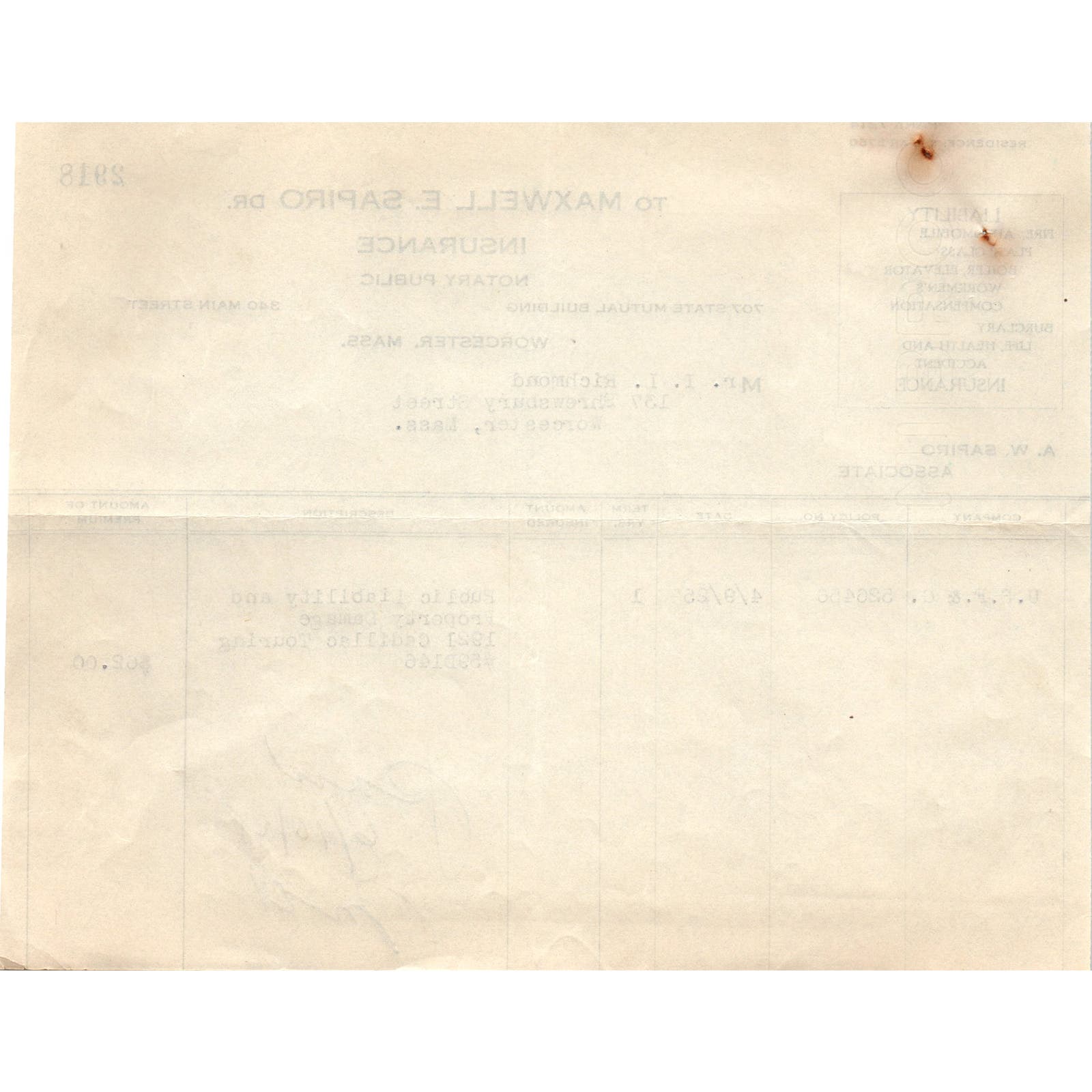 Maxwell E. Sapiro Ins Worcester 1925 Original Billhead Letterhead Receipt D8