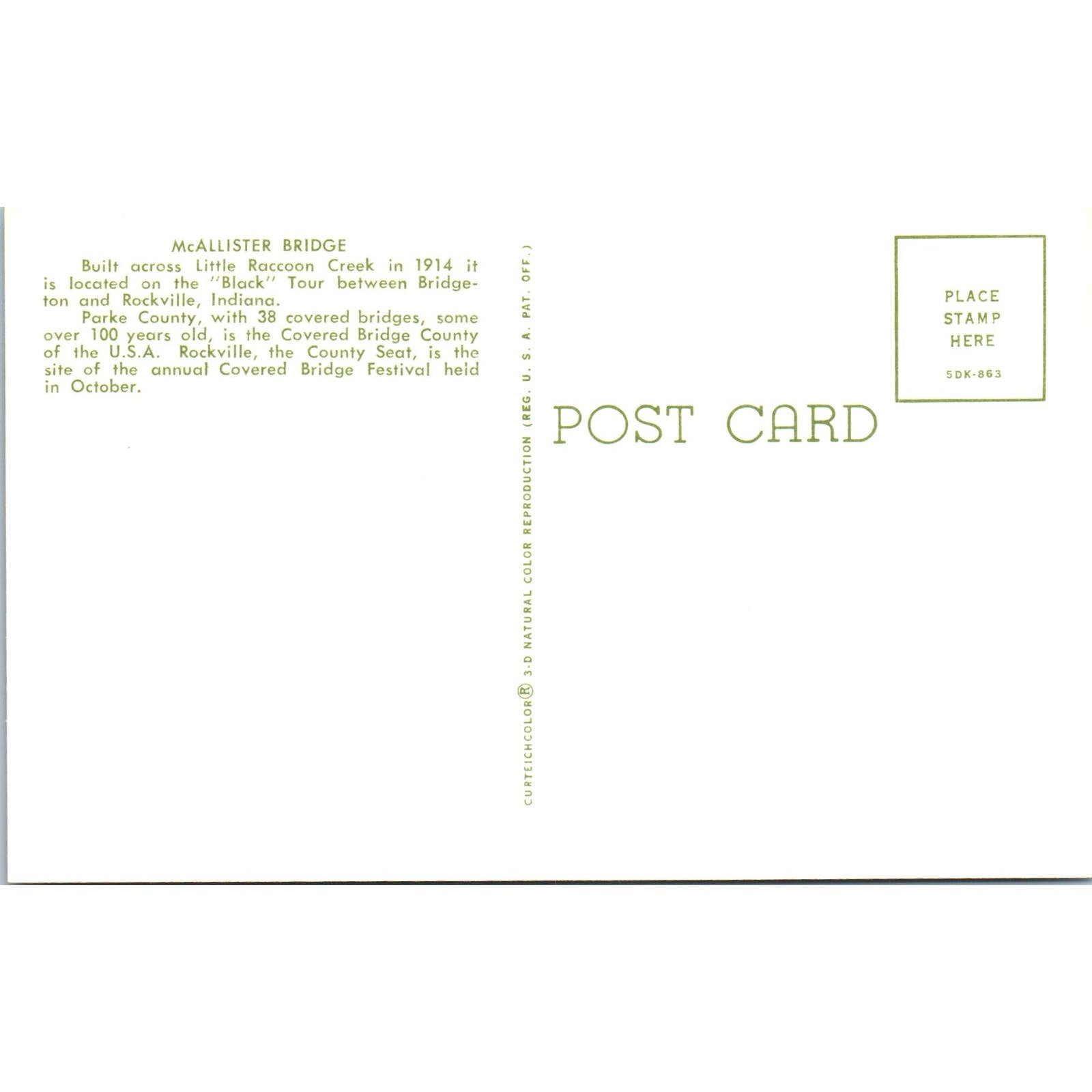 McAllister Bridge Little Raccoon Creek Rockville IN Covered Bridge Postcard PD3