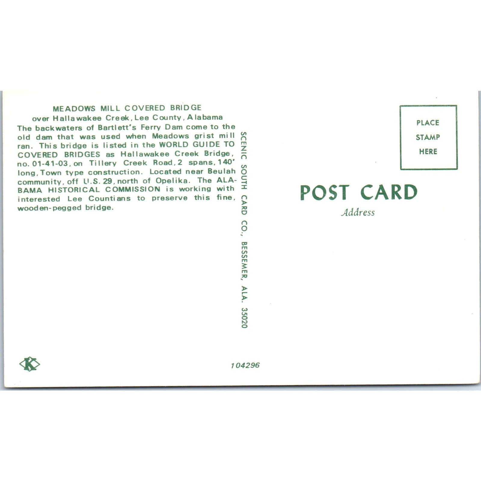 Meadows Mill Bridge Halawakee Creek Lee County AL Covered Bridge Postcard PB13