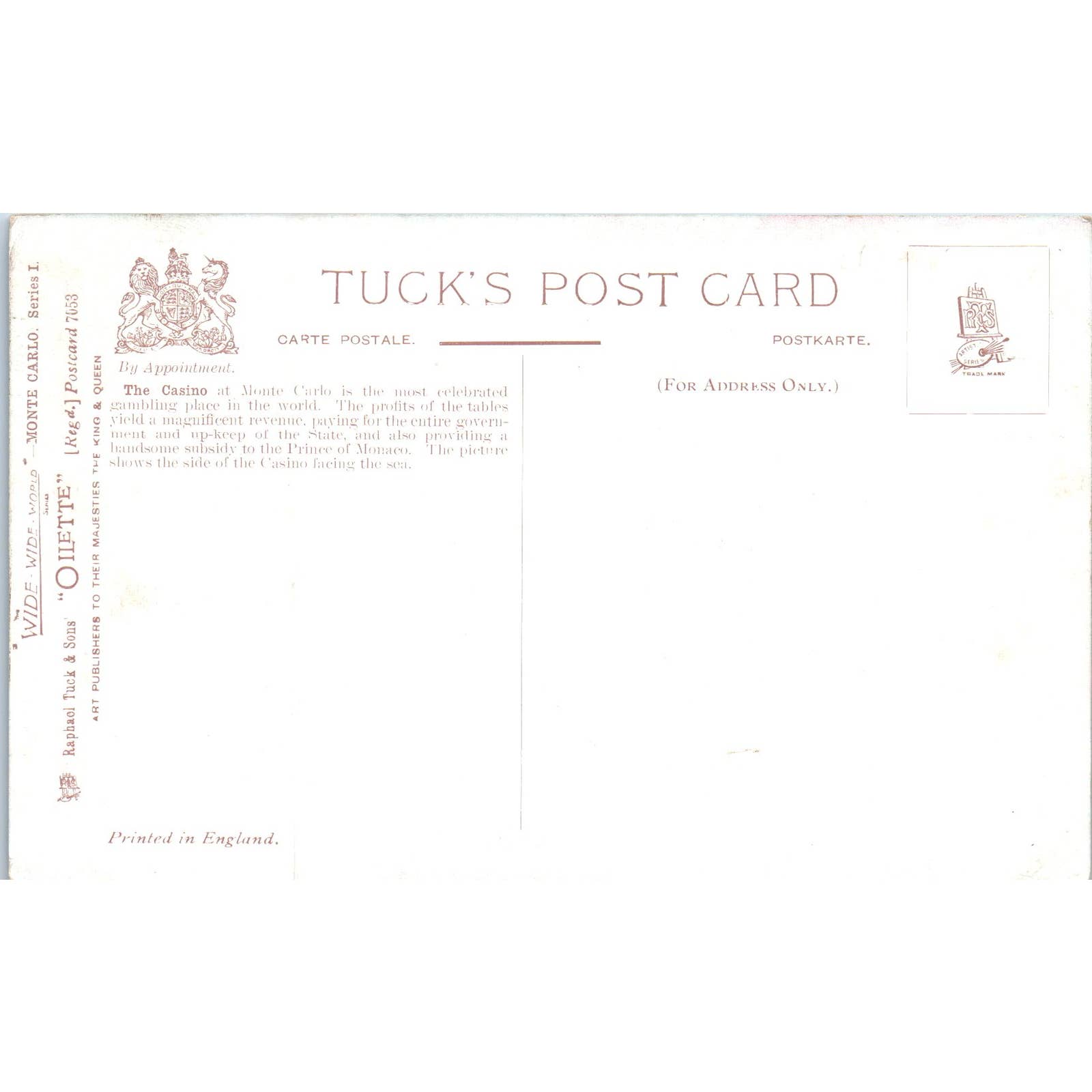 Monte Carlo Casino Raphael Tuck Oilette Original Postcard TK1-P17