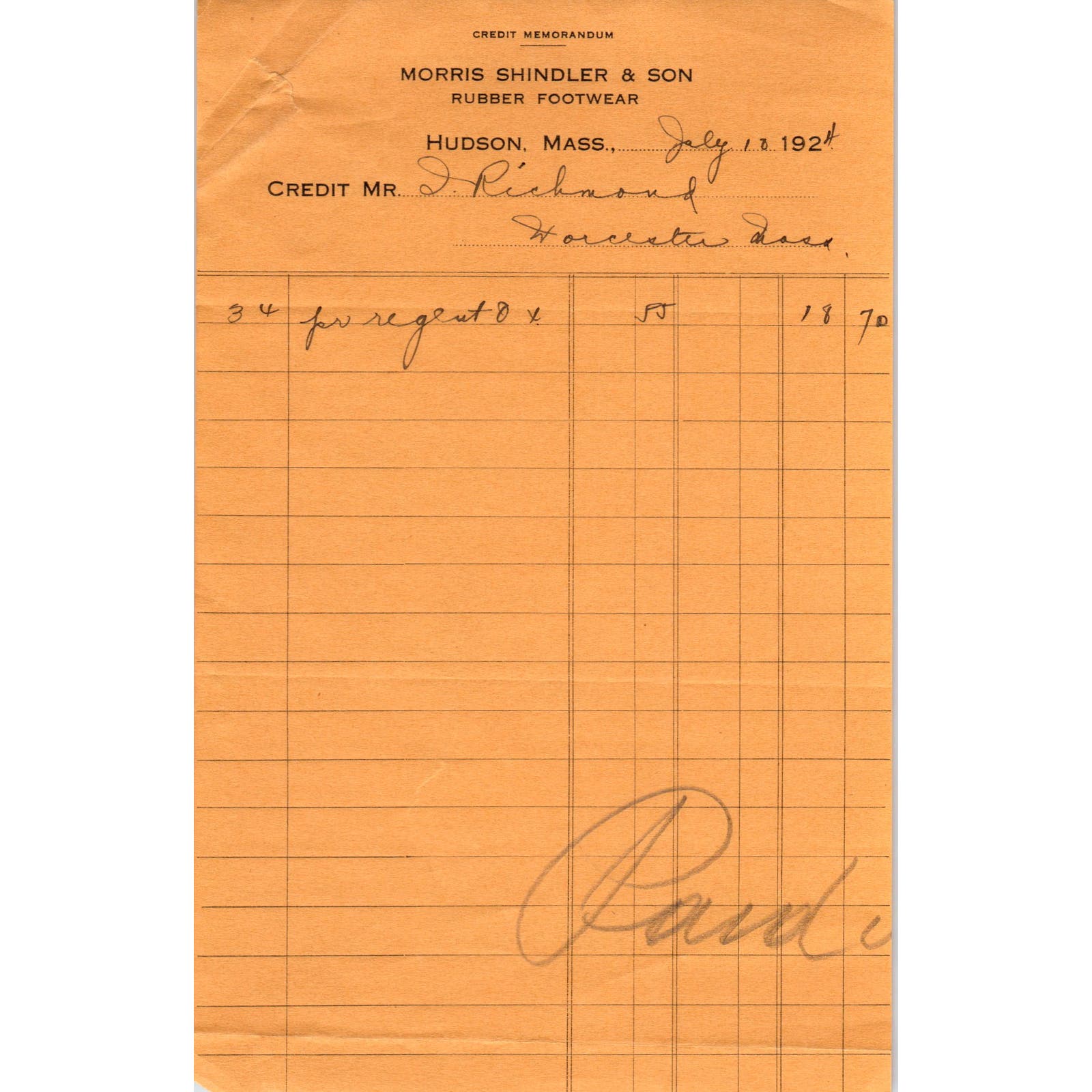 Morris Shindler & Son Rubber Footwear Hudson MA 1924 Original Billhead Letterhead Receipt D8-LL