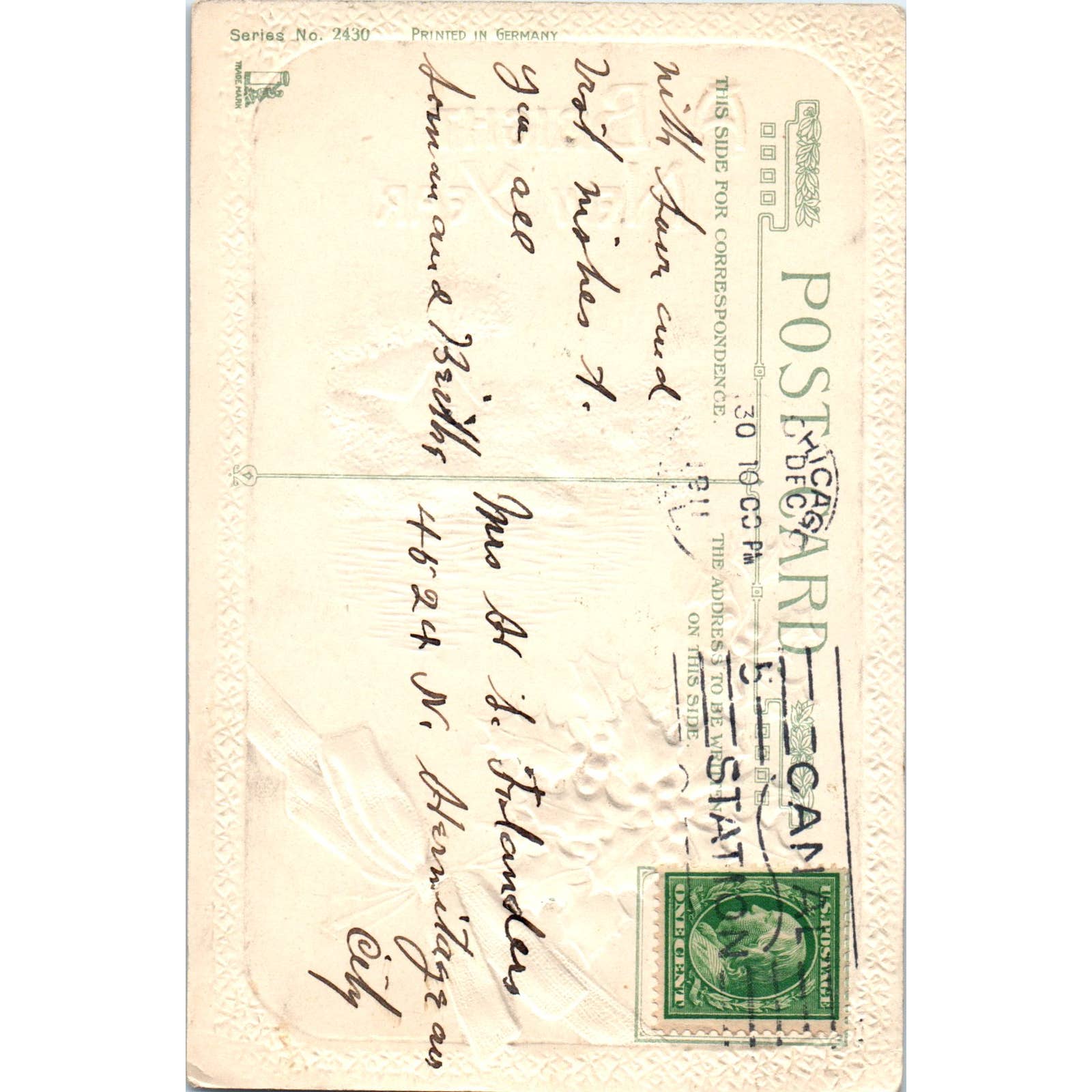 New Years Greeting Embossed Holly Winter Cottage - Original Postcard TJ7-RP3